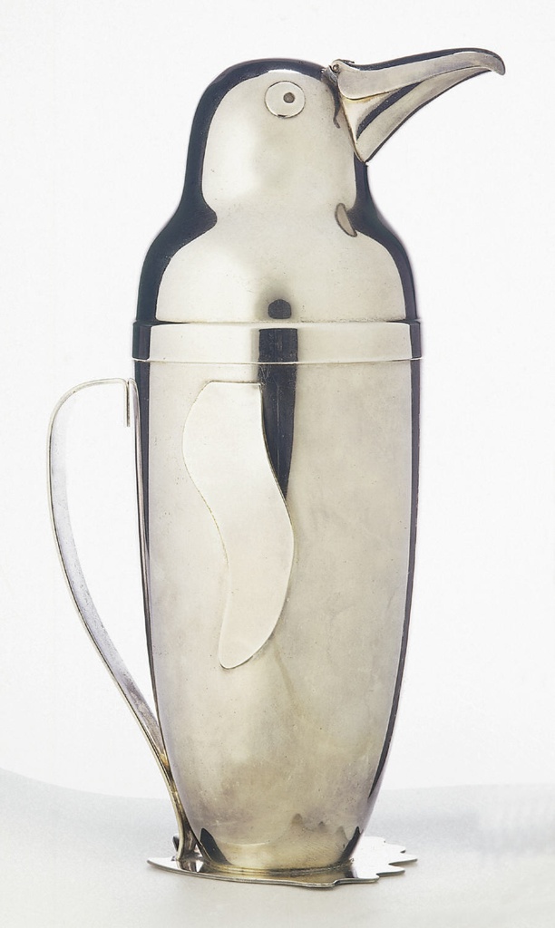 A humorous design, this penguin-shaped cocktail shaker was manufactured in 1936, two years after the release of The Thin Man, and captures two other traits of 1930s cocktail culture: novelty and pleasure. Standing a little over a foot tall, one can easily imagine this silver-plated shaker glistening with moisture from the cold beverage inside of it. In fact, the shaker’s purpose draws upon the penguin’s literal associations to both ice and cold, giving it a tongue-in-cheek quality. In the 1930s the Napier Company began to focus on its giftware line, which included barware. In the December 1936 issue of Vogue, their feature “Vogue’s 100 Gifts,” mentions a glass liquor set, ashtray, and a bartowel specifically designed for a cocktail shaker, as potential holiday gifts. Amusingly, the caption for the bartowel is “Help your friends pass their bar exams with this imported linen bartowel with its escape proof pocket for the cocktail shaker.”[1] Napier was right on the mark for creating barware for gift-giving.