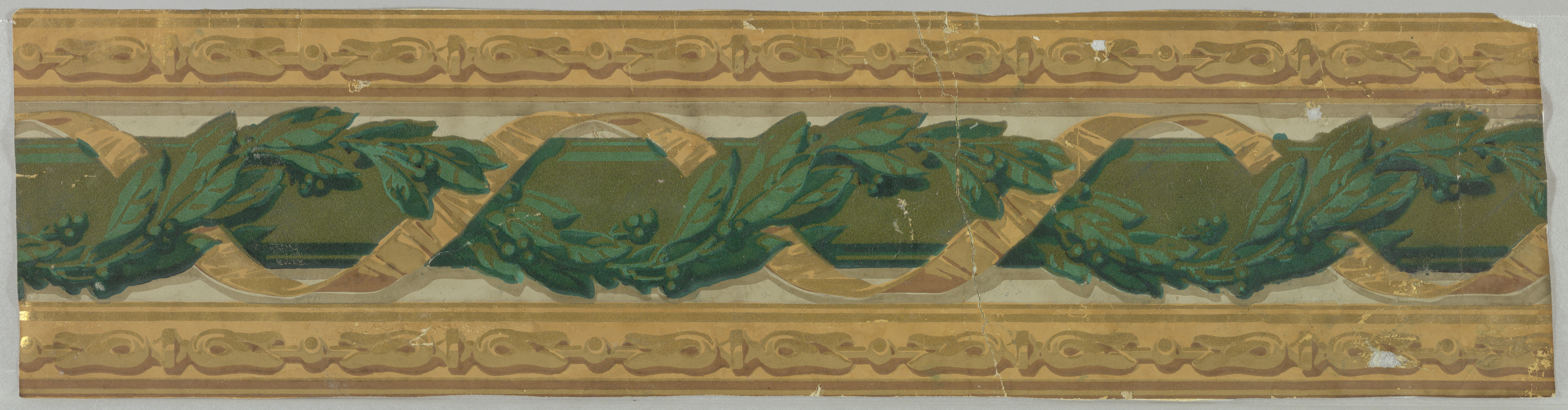 This is a Border. It is dated 1870–1900 and we acquired it in 1972. Its medium is block-printed and flocked on paper. It is a part of the Wallcoverings department.