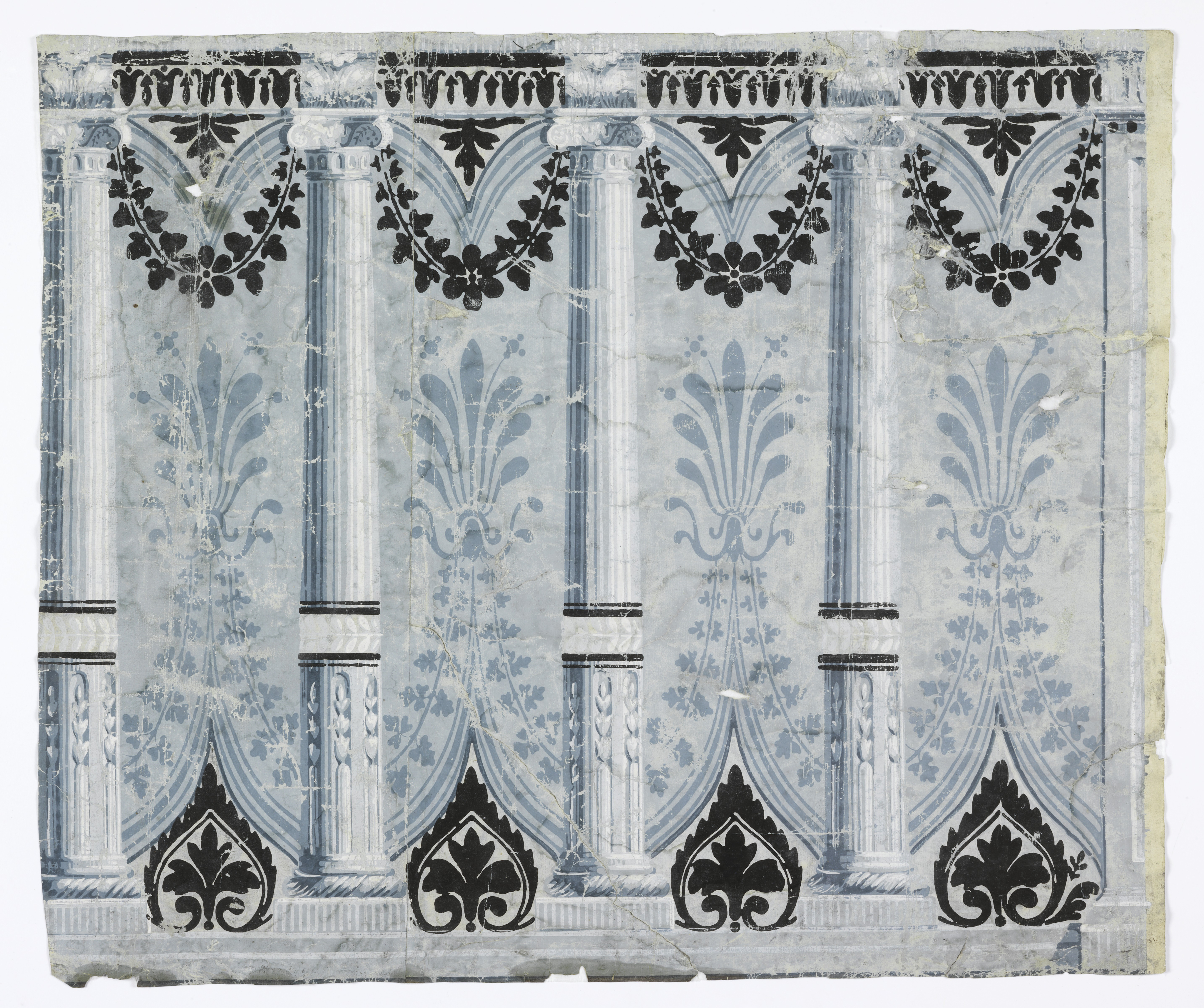 This is a frieze. It is dated 1800–1850 and we acquired it in 1972. Its medium is block-printed on handmade paper. It is a part of the Wallcoverings department.
