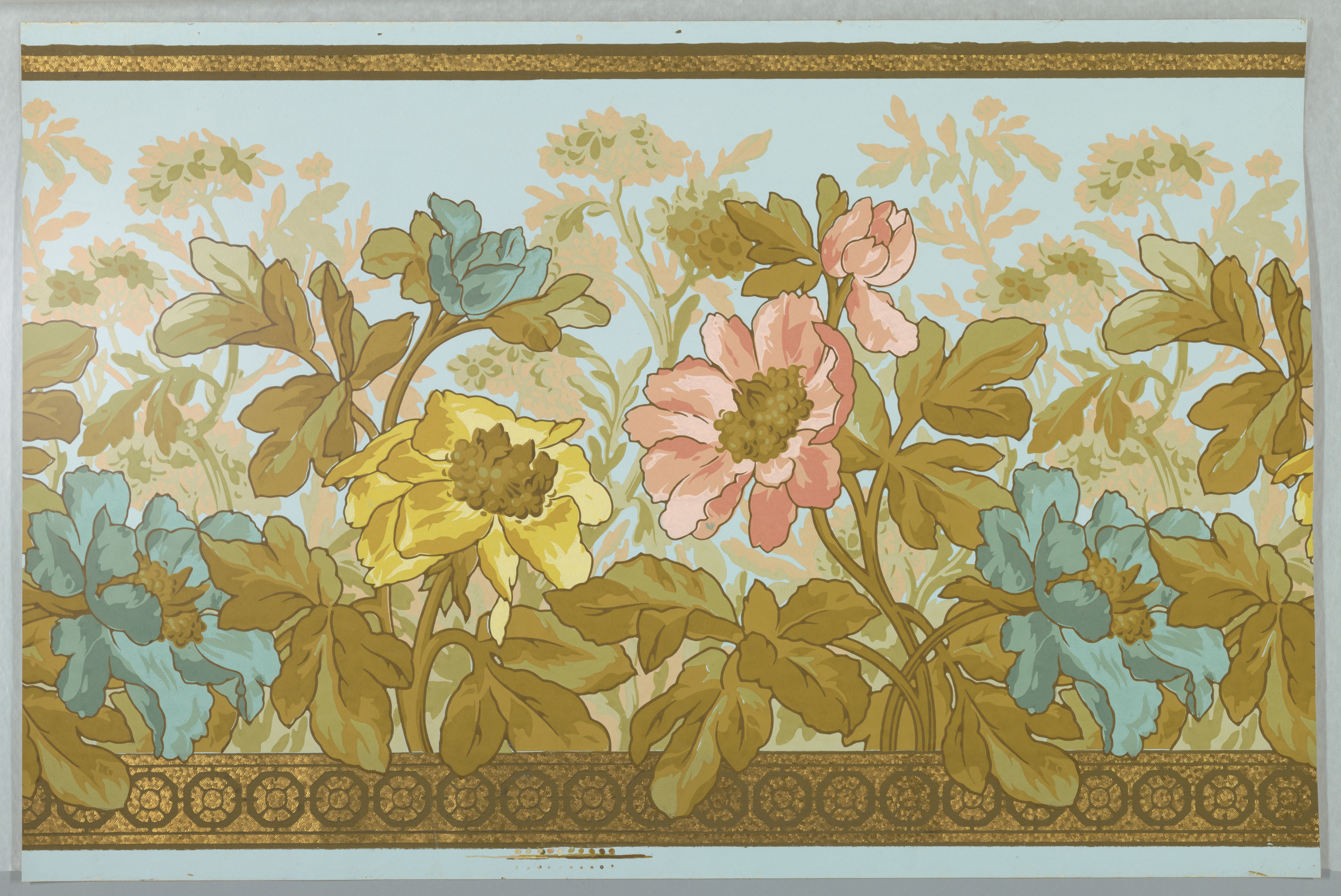 This is a frieze. We acquired it in 1972. Its medium is machine-printed on textured paper. It is a part of the Wallcoverings department.