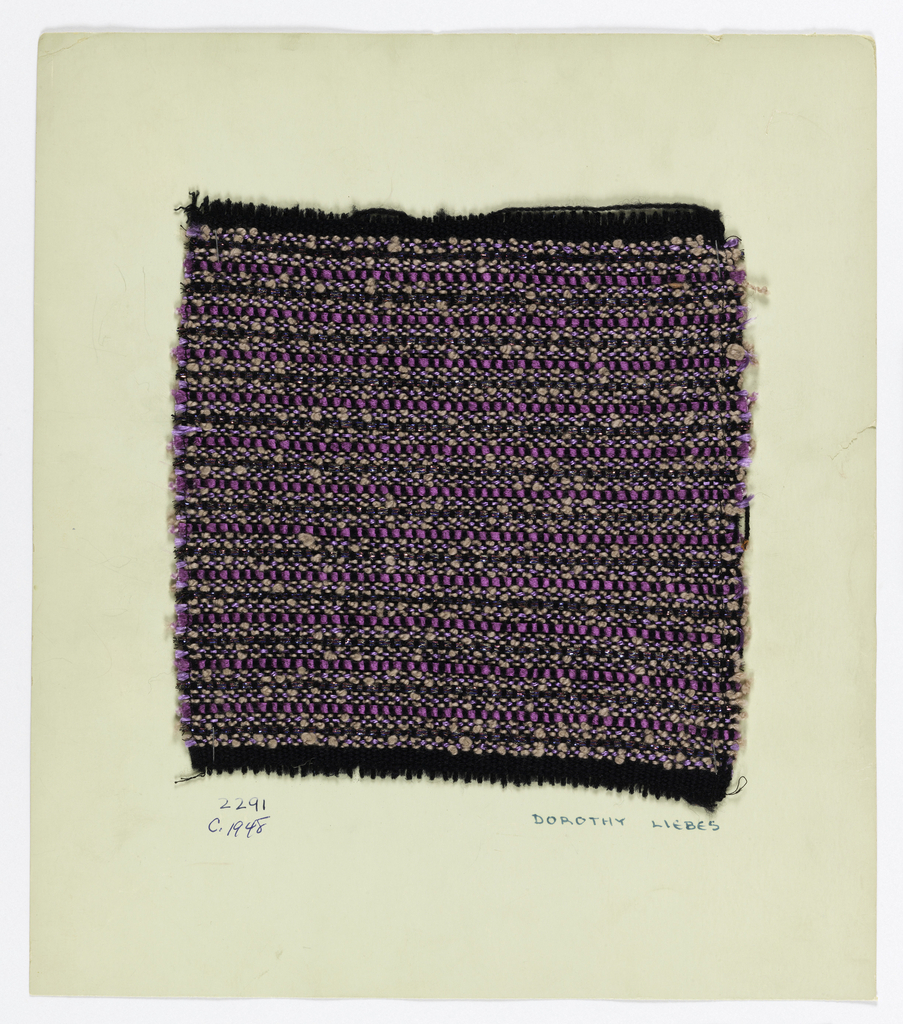 This is a Sample card. It was designed by Dorothy Wright Liebes and woven by Dorothy Wright Liebes. It is dated ca. 1948 and we acquired it in 1972. Its medium is cotton, viscose rayon, wool, copper yarn and its technique is plain weave. It is a part of the Textiles department.