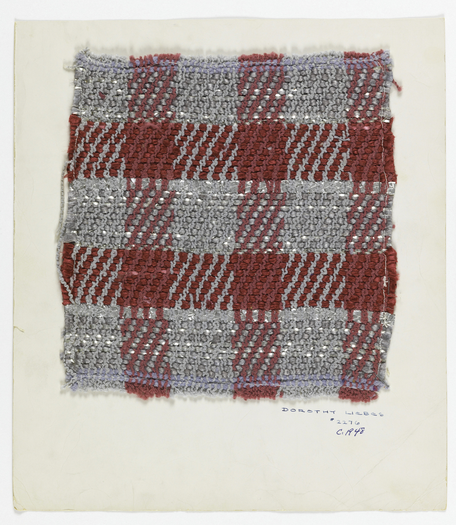 This is a Sample card. It was designed by Dorothy Wright Liebes and woven by Dorothy Wright Liebes. It is dated ca. 1948 and we acquired it in 1972. Its medium is cotton, viscose rayon, silk, cellulose acetate-laminated aluminum yarn, cellulose acetate butyrate-laminated aluminum yarn and its technique is 2/2 twill plain woven. It is a part of the Textiles department.