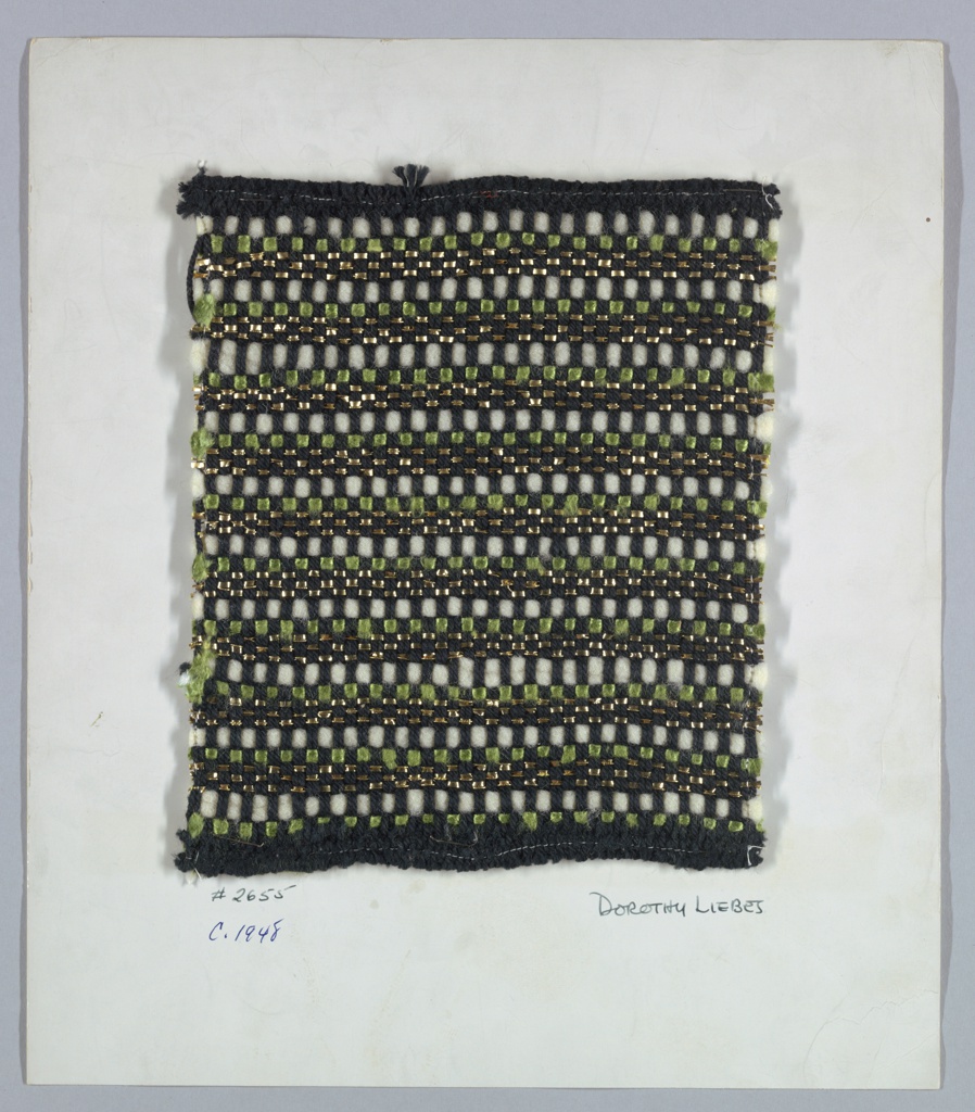 This is a Sample card. It was designed by Dorothy Wright Liebes and woven by Dorothy Wright Liebes. It is dated ca. 1948 and we acquired it in 1972. Its medium is cotton, viscose rayon, wool, cellulose acetate butyrate-laminated aluminum yarn and its technique is plain weave with paired warps and paired and unpaired wefts. It is a part of the Textiles department.