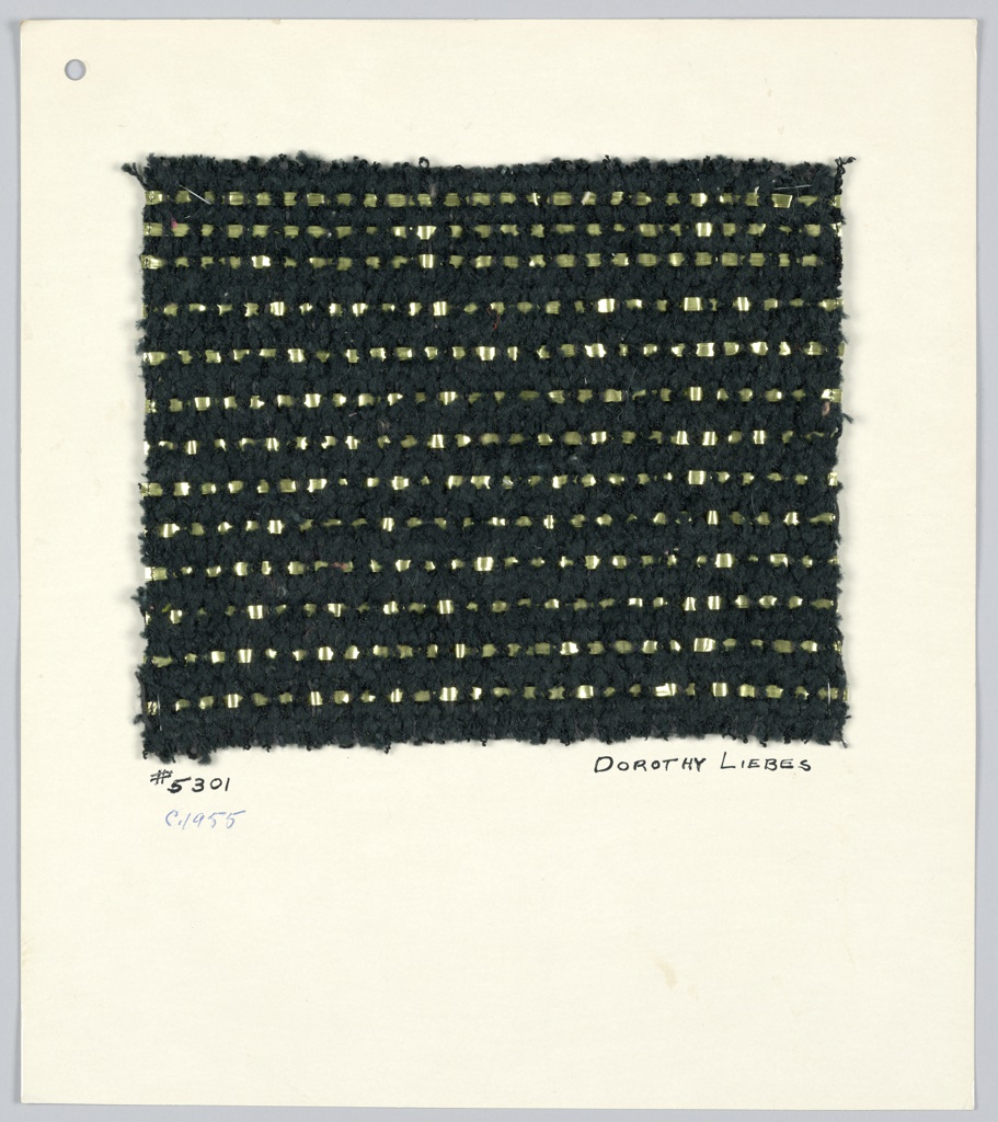Sample Card (USA); Designed by Dorothy Wright Liebes (American, 1897–1972); cotton, viscose rayon, cellulose acetate-laminated aluminum yarn; H x W (sample): 17.3 × 20.6 cm (6 13/16 × 8 1/8 in.) H x W (card): 31.8 × 27.9 cm (12 1/2 in. × 11 in.); Gift of the Estate of Dorothy Liebes Morin; 1972-75-99