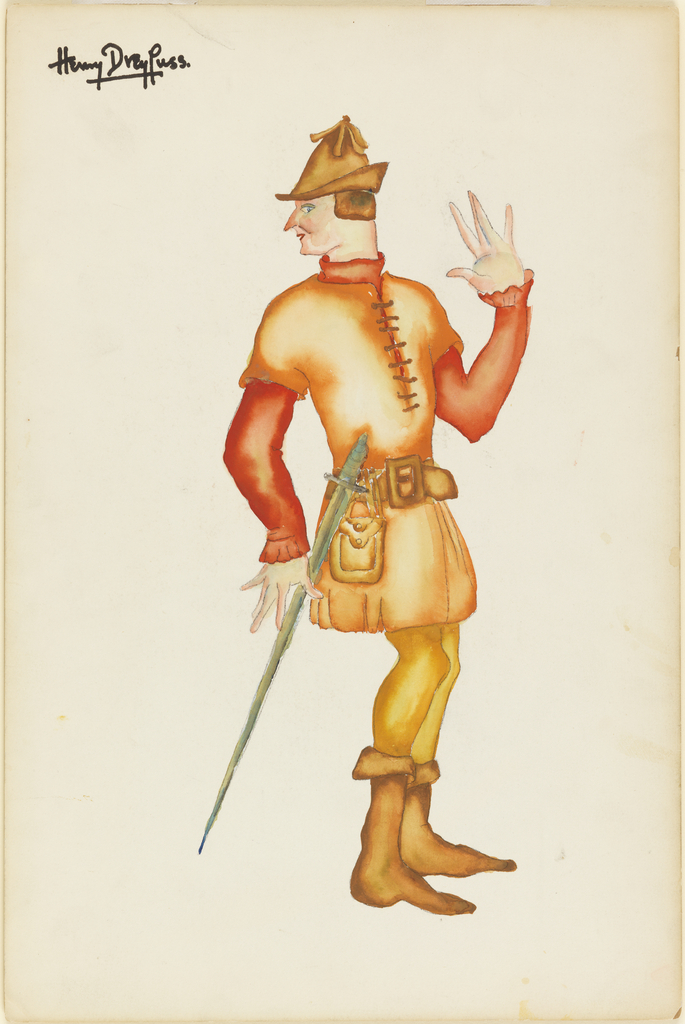 Drawing, Costume Design: Man with Sword, for The Merry Wives of Windsor; Designed by Henry Dreyfuss (American, 1904–1972); USA; graphite, brush and watercolor on illustration board; Sheet: 37.9 x 25.2 cm (14 15/16 x 9 15/16 in.); Gift of University of California, Los Angeles; 1973-15-126