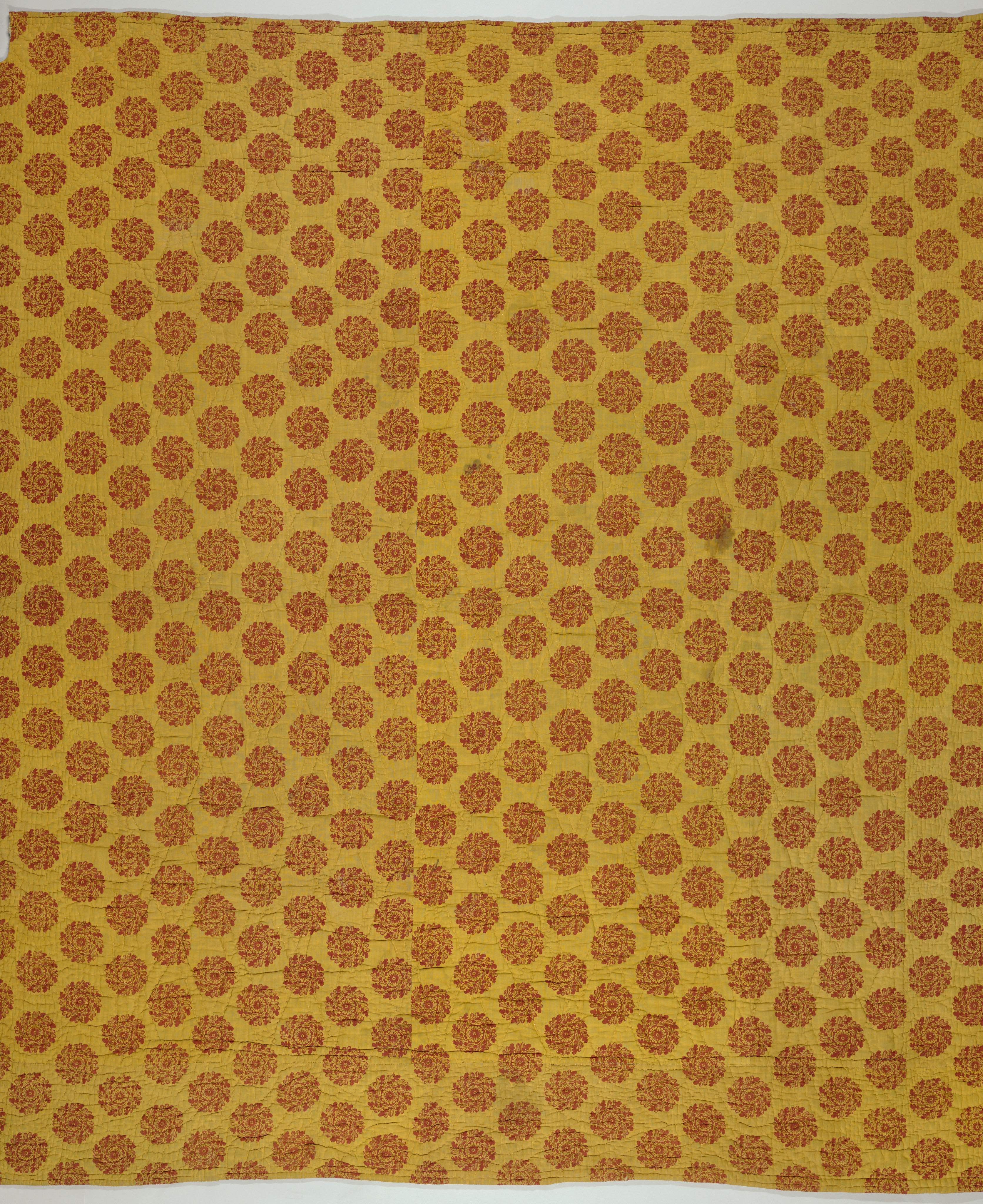 This is a Quilt. It is dated 18th–early 19th century and we acquired it in 1973. Its medium is cotton and its technique is printed by engraved roller on plain weave; running stitches throuhg three layers. It is a part of the Textiles department.