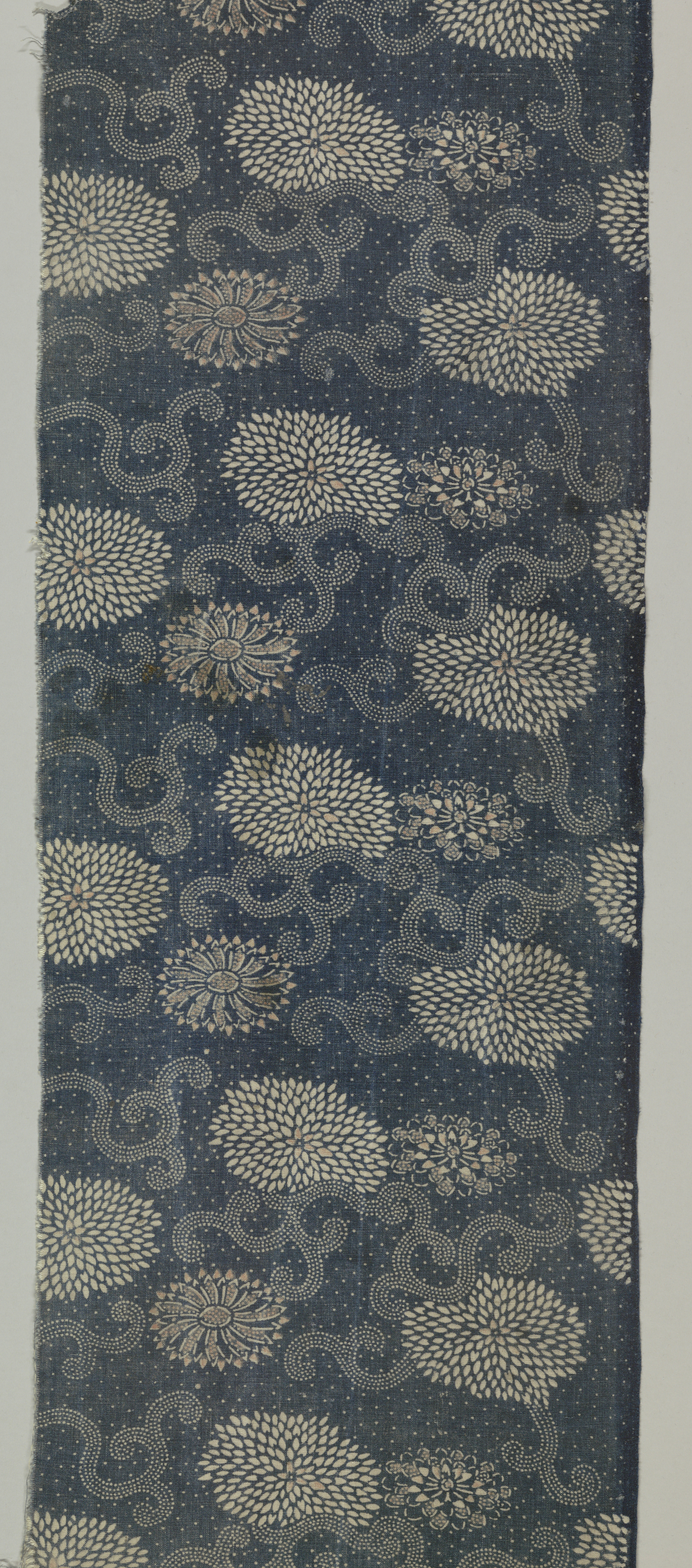 This is a Textile. It is dated 19th century and we acquired it in 1973. Its medium is cotton and its technique is stenciled resist (katazome) on plain weave. It is a part of the Textiles department.