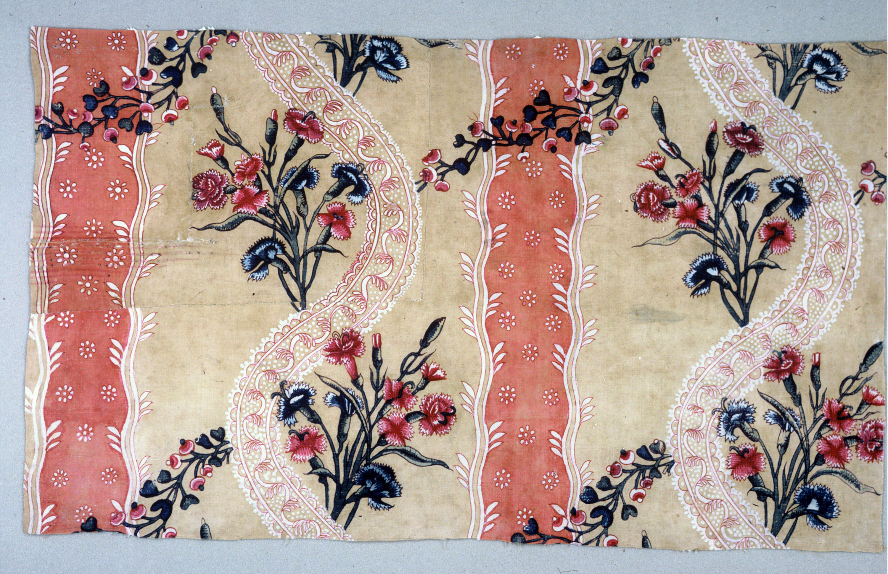 This is a Chintz. It is dated 18th century and we acquired it in 1973. Its medium is cotton and its technique is mordants for 3 reds and black applied by pen and brush; madder dyed; 2 blues applied by brush over resist; yellow applied by immersion over resist; madder in orange stripe applied by block; chintz on plain weave. It is a part of the Textiles department.