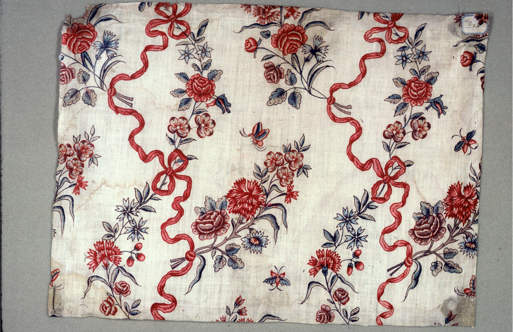 This is a Textile. It is dated 1750–1800 and we acquired it in 1973. Its medium is cotton and its technique is mordants for 2 reds, purple and black applied by pen and brush; madder dyed; blue applied over resist; yellow applied over blue for green, (chintz) on plain weave. It is a part of the Textiles department.