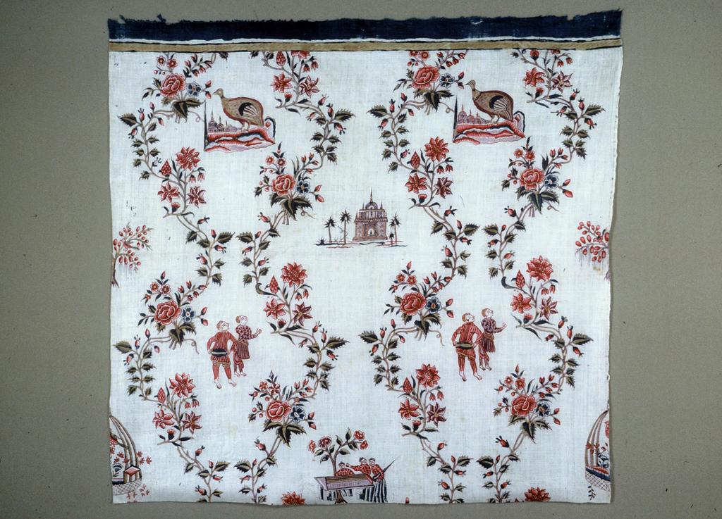 This is a Chintz. It is dated 18th century and we acquired it in 1973. Its medium is cotton and its technique is mordants (black, brown, 2 reds, 2 purples) and dye (yellow) applied by pen or brush; blue applied by brush; chintz on plain weave. It is a part of the Textiles department.