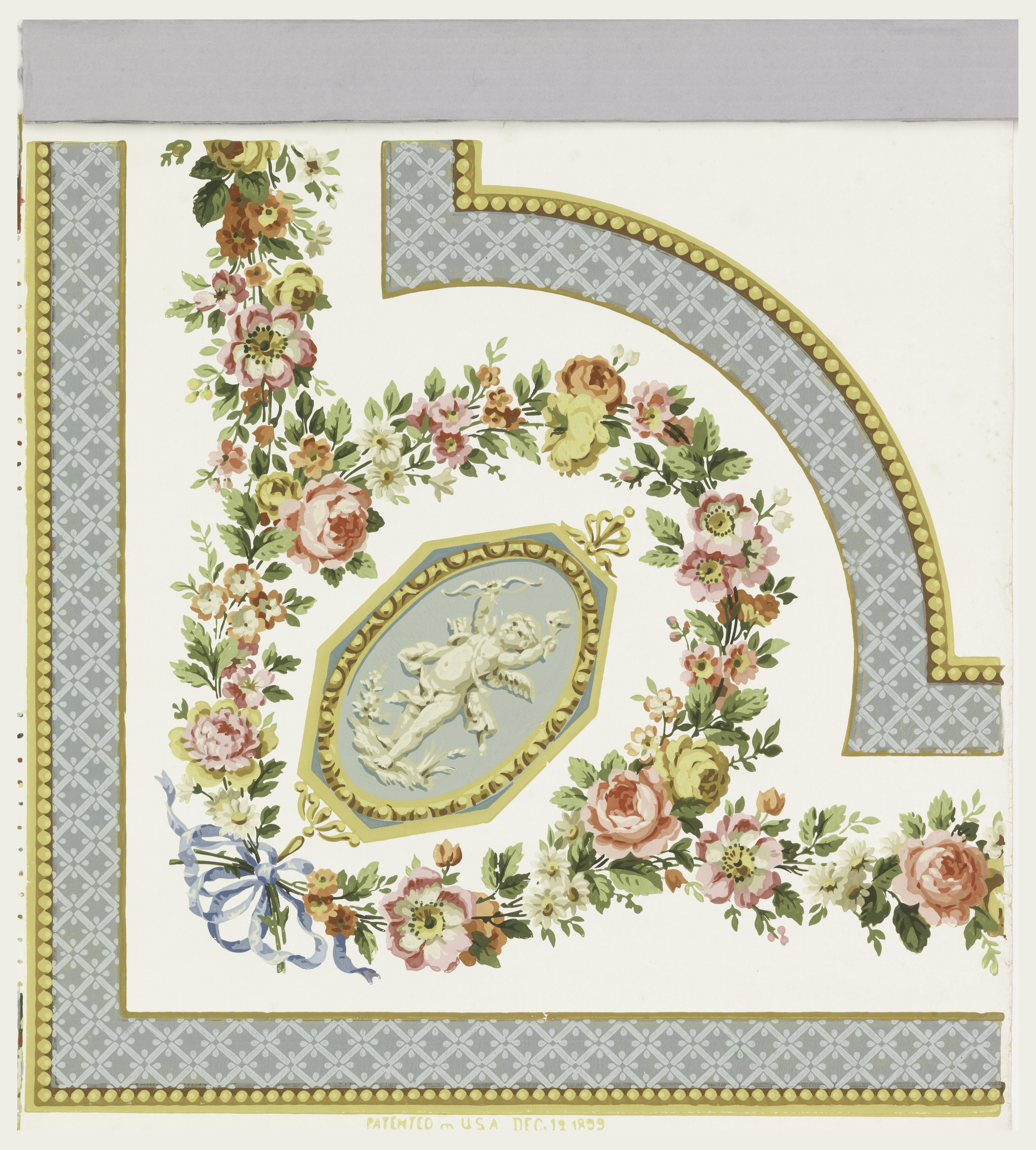 This is a ceiling border. It was manufactured by Zuber & Cie. It is dated 1899 and we acquired it in 1973. Its medium is block-printed on paper. It is a part of the Wallcoverings department.
