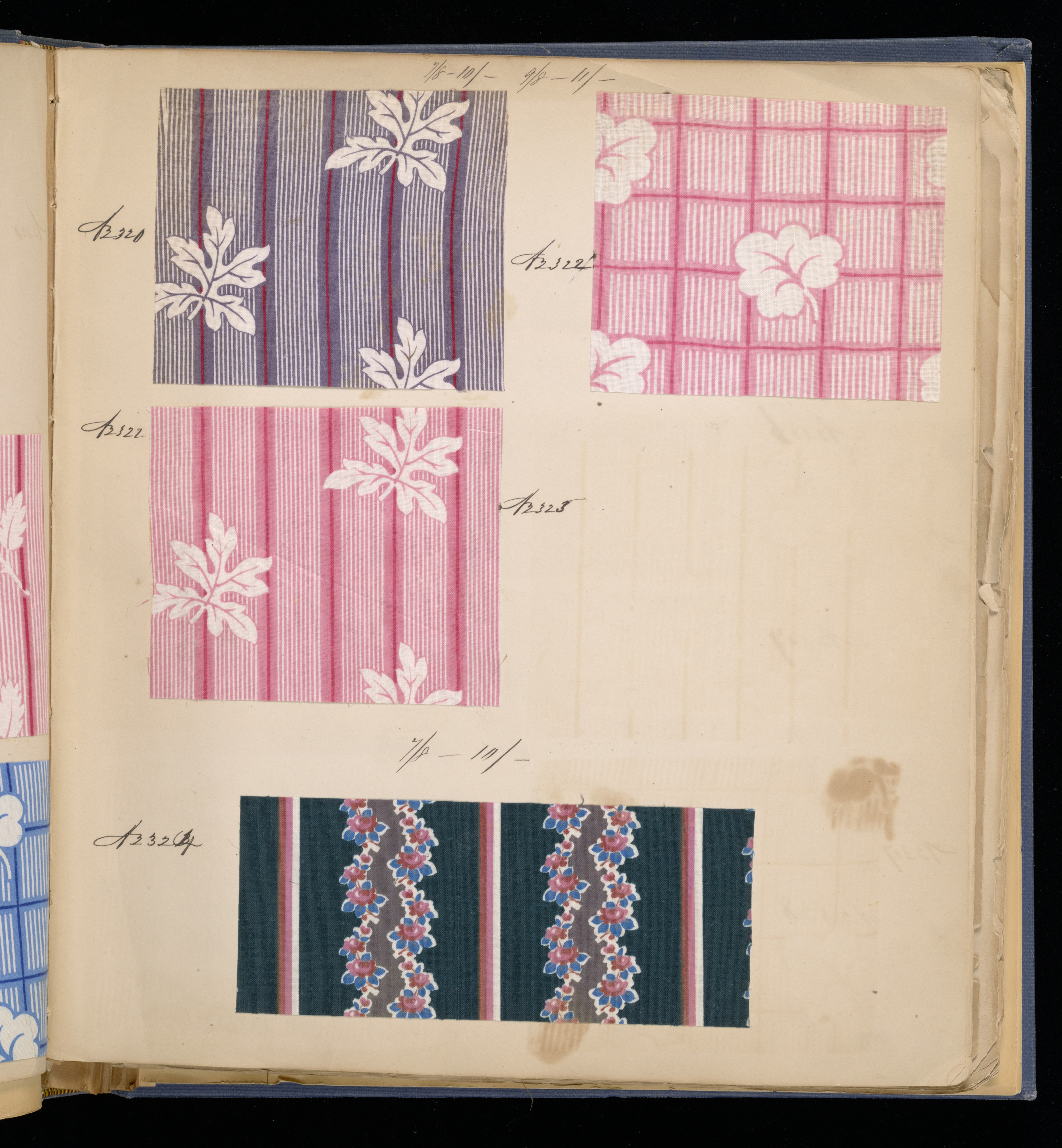Novelty dress prints of the mid-nineteenth century are evident in this French sample book. Unlike the luxurious woven silks of the eighteenth century that required skilled designers and weavers throughout the entire process, designs for printed cotton textiles were created for the most part anonymously.