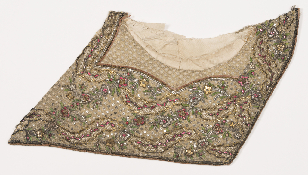 This is a Waistcoat fragments. It is dated 1750–1775 and we acquired it in 1973. Its medium is silk, metallic thread, sequins, colored foil. It is a part of the Textiles department.