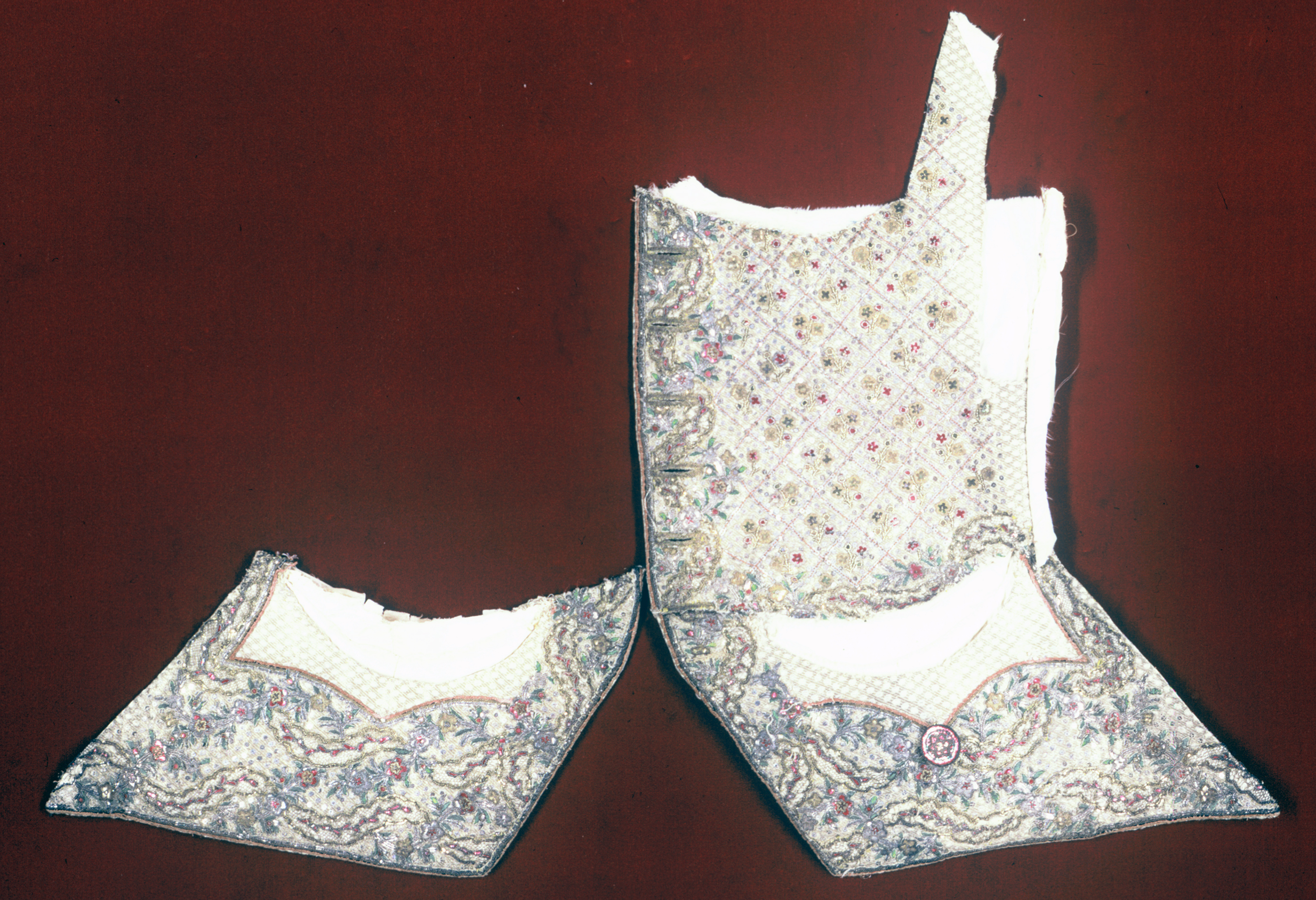 Waistcoat Fragments; silk, metallic thread, sequins, colored foil; Gift of Richard V. Hare; 1973-82-3-a/c