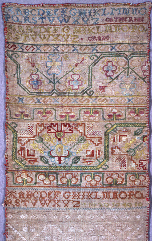 Sampler (England); linen, silk, metallic; H x W: 58.5 x 19.5 cm (23 1/16 x 7 11/16 in.); Gift of Anonymous Donor from the Fraser/Martin Collection; 1974-100-19