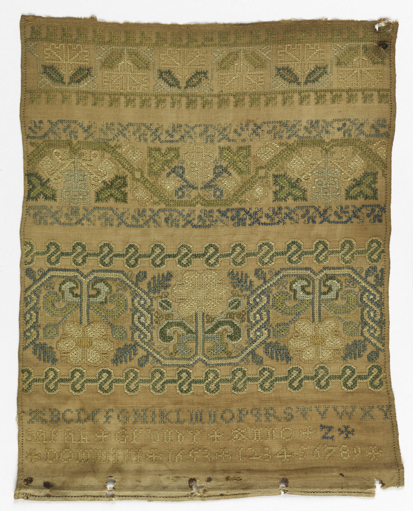 Sampler (England); Embroidered by Sarah Grundy; silk embroidery on linen foundation; H x W: 22.9 x 19.1 cm (9 x 7 1/2 in.); Bequest of Rosalie Coe, from the collection inherited from her mother, Eva Johnston Coe; 1974-42-14