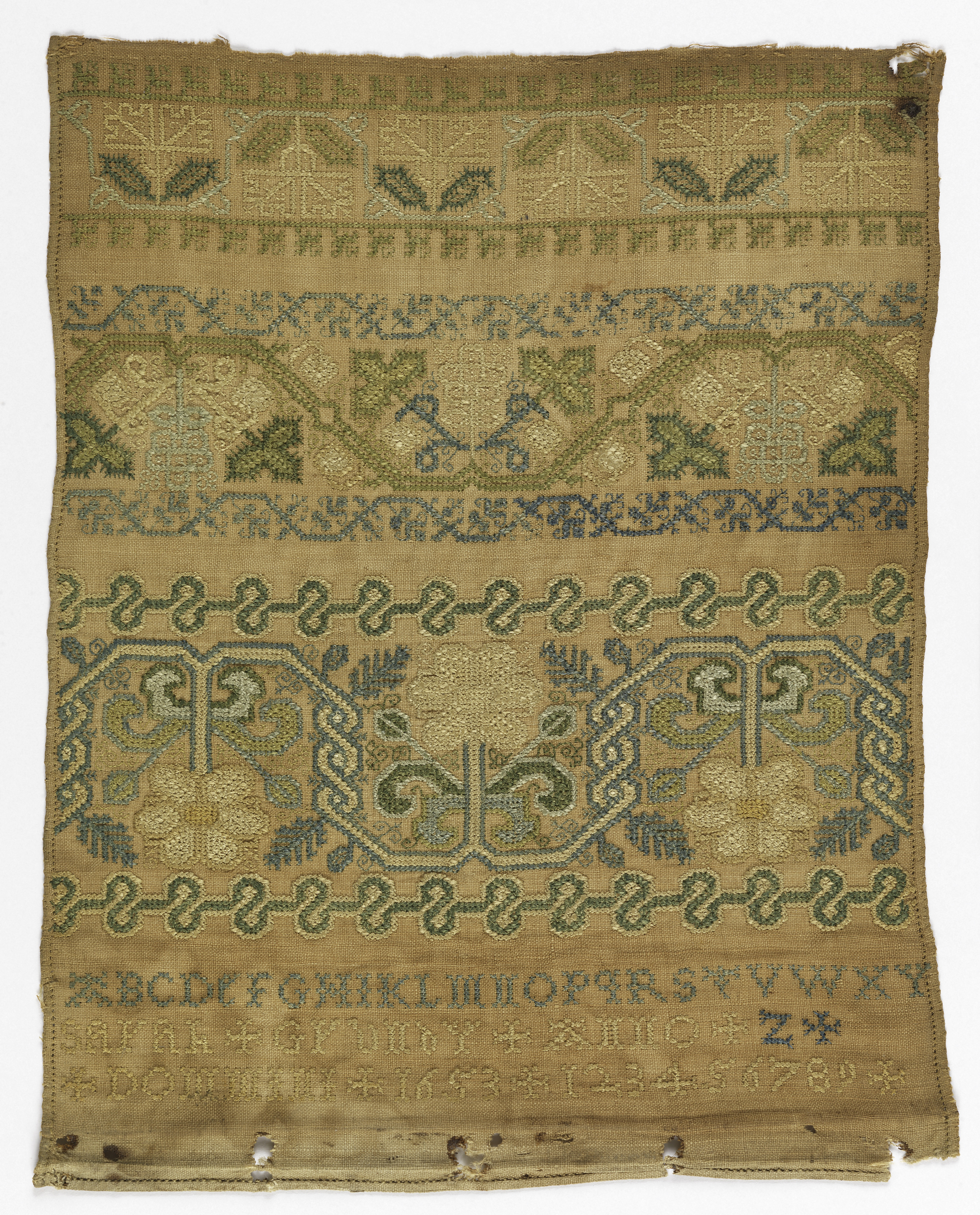 This is a Sampler. It was embroidered by Sarah Grundy. It is dated 1653 and we acquired it in 1974. Its medium is silk embroidery on linen foundation and its technique is counted stitches; cross, long-armed cross, and four-sided cross stitch on plain weave foundation. It is a part of the Textiles department.