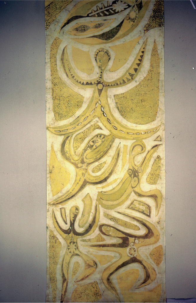 This is a Hanging. It was designed by Mary Dumas. It is dated 1935–71 and we acquired it in 1974. Its medium is cotton and its technique is resist dyed. It is a part of the Textiles department.