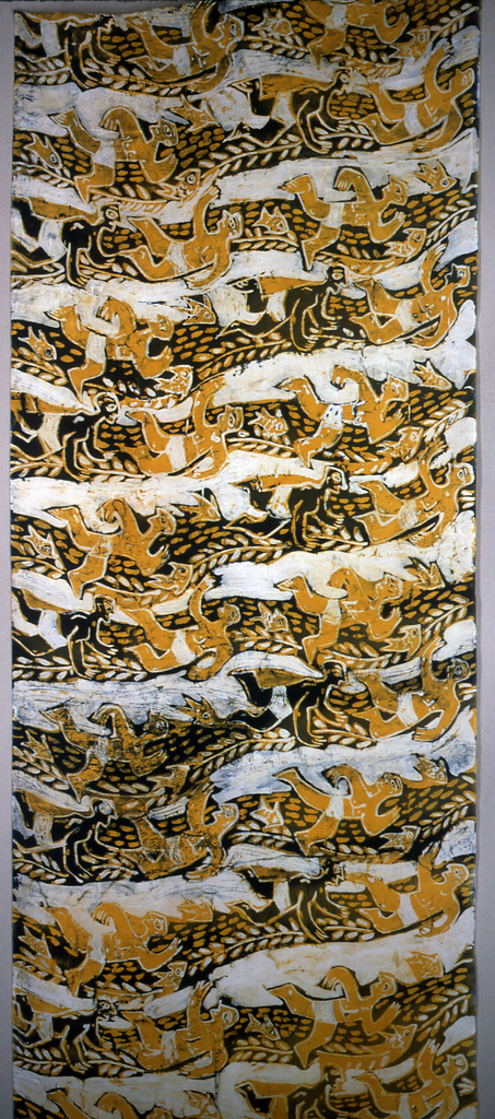 This is a panel. It was designed by Mary Dumas. It is dated 1935–71 and we acquired it in 1974. Its medium is silk and its technique is resist dyed. It is a part of the Textiles department.