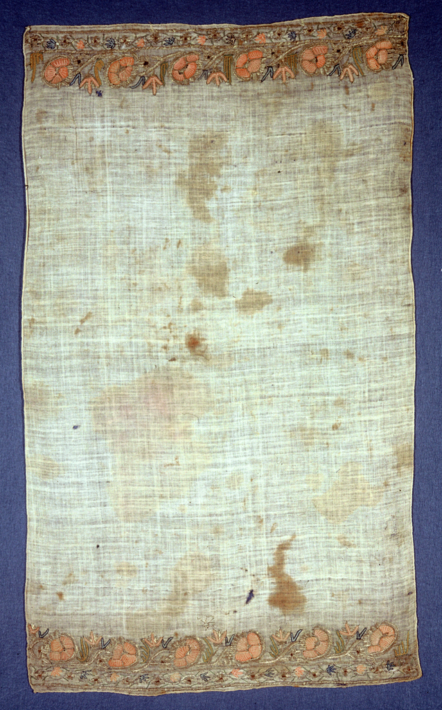 This is a Towel. It is dated 19th–early 20th century and we acquired it in 1974. Its medium is silk and metal-wrapped silk on cotton ground and its technique is double running and satin stitches on plain weave. It is a part of the Textiles department.