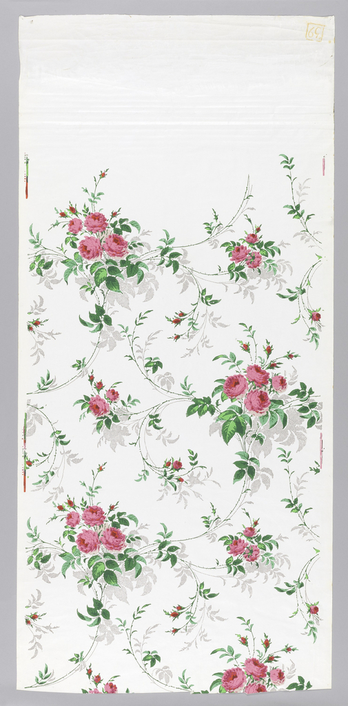 This is a Sidewall. It is dated 1830–50 and we acquired it in 1974. Its medium is block-printed, distemper colors, machine made paper. It is a part of the Wallcoverings department.