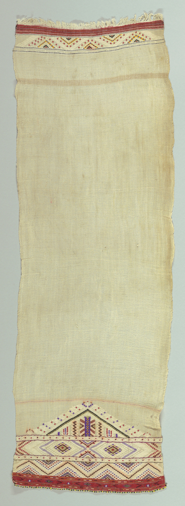 This is a Towel. It is dated 1920–30 and we acquired it in 1974. Its medium is cotton, silk, metal-wrapped cotton and its technique is plain weave with discontinuous supplementary weft; occasional bands of paired weft in different colors; warp overspun z. It is a part of the Textiles department.