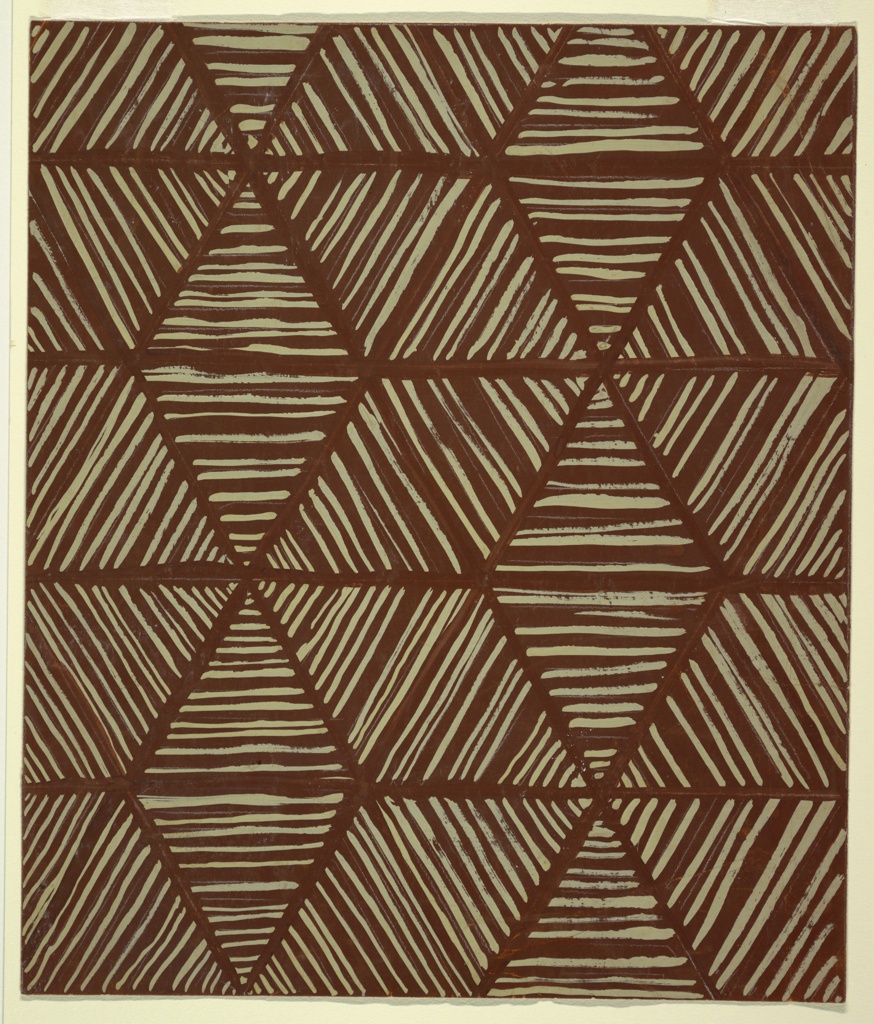 Drawing, Design for Textile: Striped Triangles; Drafted by Donald Deskey (American, 1894–1989); USA; brush and brown and grey gouache, white crayon, graphite on beige wove paper ; 41.8 x 35.3 cm (16 7/16 x 13 7/8 in.) Mat: 55.9 x 40.6 cm (22 x 16 in.); Gift of Donald Deskey; 1975-11-24