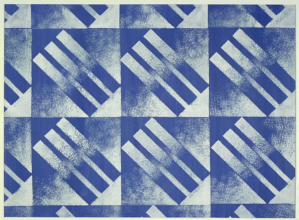 Drawing, Textile Design: Blue and White Squares and Rectangles; Drafted by Donald Deskey (American, 1894–1989); Office of Donald Deskey Associates; USA; brush and blue and white gouache, graphite on off-white illustration board; 50.9 x 37.7 cm (20 1/16 x 14 13/16 in.) Mat: 71.1 x 55.9 cm (28 x 22 in.); Gift of Donald Deskey; 1975-11-27