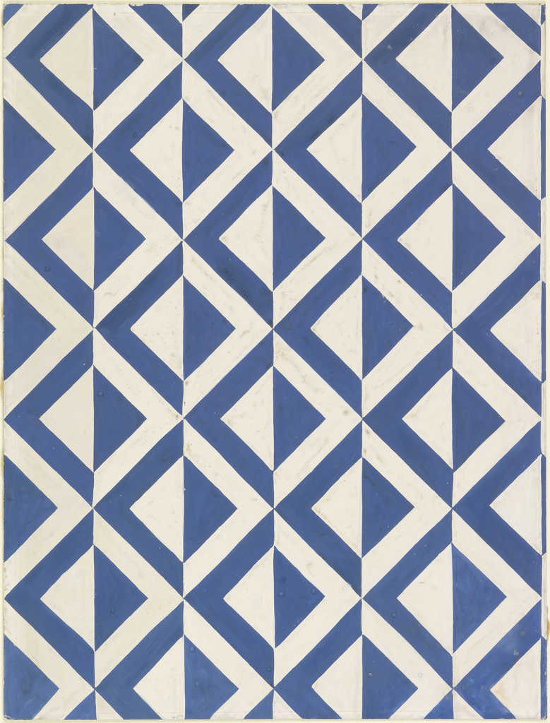 Drawing, Textile Design: Blue and White Alternating Triangles; Drafted by Donald Deskey (American, 1894–1989); USA; brush and white and blue gouache on gray illustration board ; 50.6 x 38.3 cm (19 15/16 x 15 1/16 in.) Mat: 71.1 x 55.9 cm (28 x 22 in.); Gift of Donald Deskey; 1975-11-28