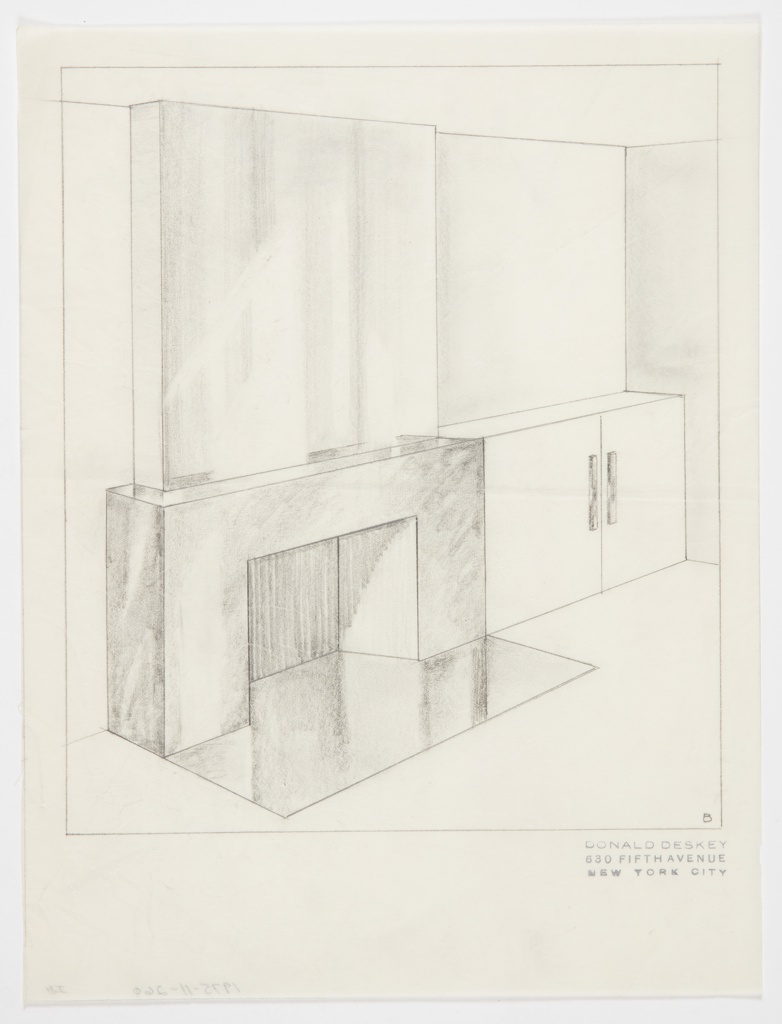 Drawing, Design for Interior, Perspective, Abby Aldrich Rockefeller and David Milton Apartment, 1 Beekman Place, New York, NY; Office of Donald Deskey Associates, Donald Deskey (American, 1894–1989); Client: Abby Aldrich Rockefeller Milton, David Milton; USA; graphite on tracing paper; H x W: 53.3 x 58.4 cm (21 x 23 in.); Gift of Donald Deskey; 1975-11-620