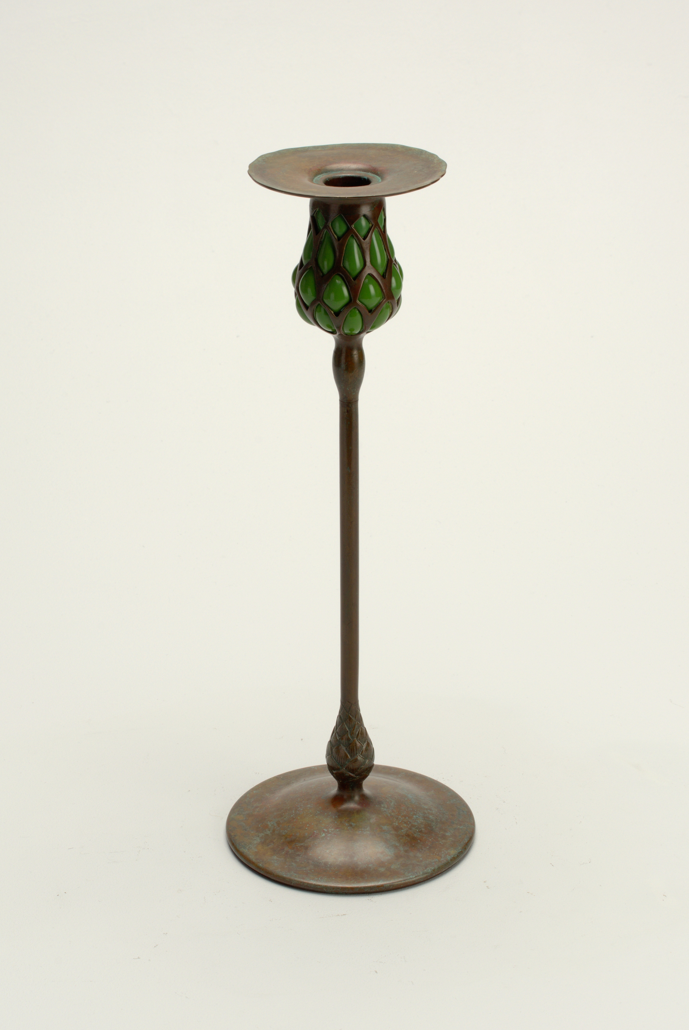 This is a candlestick. It was overseen (as design director) by Louis Comfort Tiffany and produced by Tiffany Studios. It is dated ca. 1900 and we acquired it in 1975. Its medium is mouth-blown favrile glass, cast bronze. It is a part of the Product Design and Decorative Arts department.