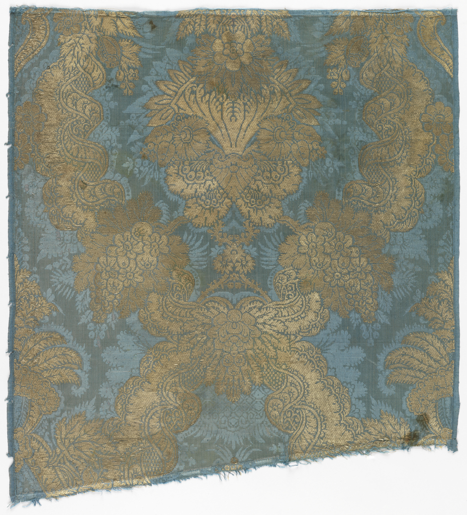 This is a Textile. It is dated 18th century and we acquired it in 1975. Its medium is silk, metallic thread and its technique is satin damask with discontinuous supplementary weft patterning (brocade). It is a part of the Textiles department.