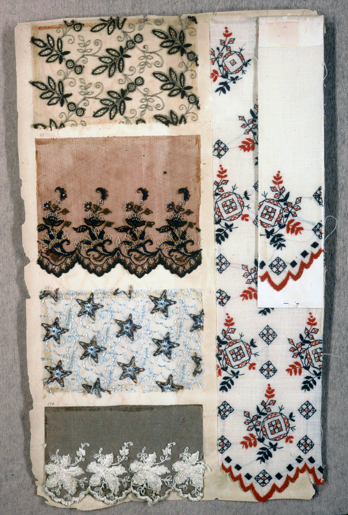 This is a Sample book pages. We acquired it in 1975. Its technique is machine made lace. It is a part of the Textiles department.