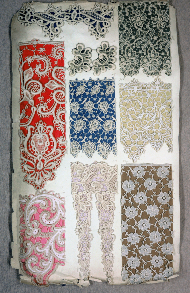 This is a Sample book pages. We acquired it in 1975. Its technique is machine made lace. It is a part of the Textiles department.