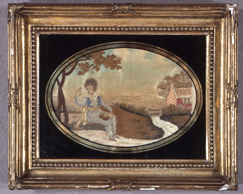 This is a Embroidered picture. It is dated ca. 1790 and we acquired it in 1975. Its medium is silk and wool embroidery on silk foundation and its technique is embroidered in stem and satin stitches on plain weave foundation; face, hands and sky are painted. It is a part of the Textiles department.