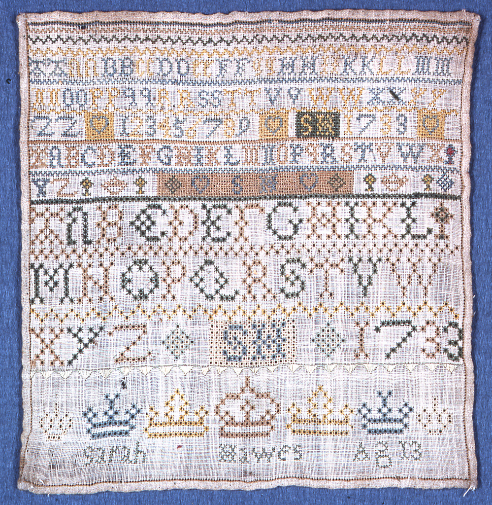 This is a Sampler. It was embroidered by Sarah Hawes. It is dated 1733 and we acquired it in 1975. Its medium is silk embroidery on linen foundation and its technique is embroidered in cross, eye and satin stitches on plain weave foundation; counted stitches. It is a part of the Textiles department.