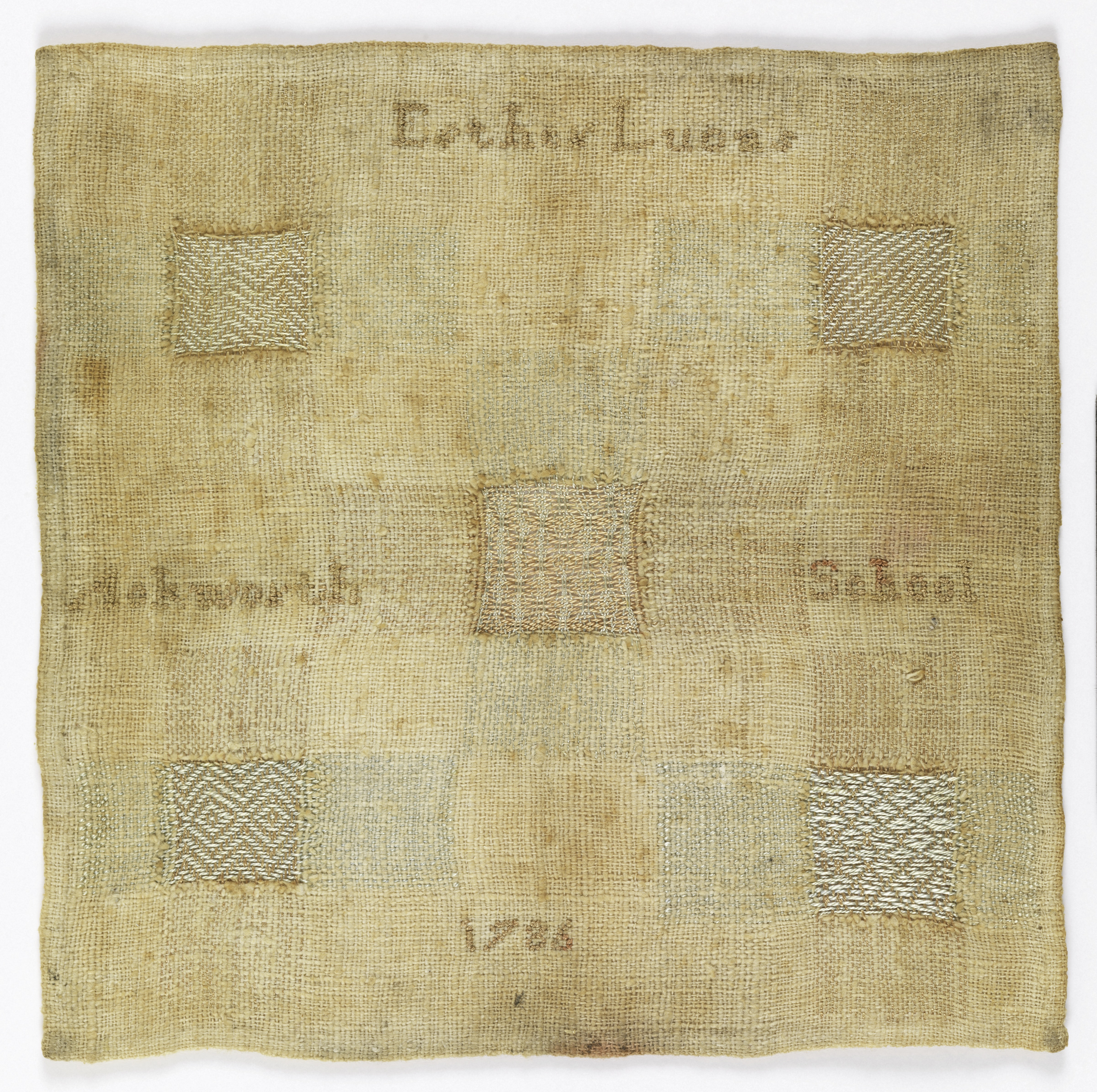This is a Darning sampler. It was embroidered by Esther Lucas and student at Ackworth School. It is dated 1785 and we acquired it in 1976. Its medium is silk embroidery on cotton foundation and its technique is running (pattern darning) and cross stitch on plain weave. It is a part of the Textiles department.