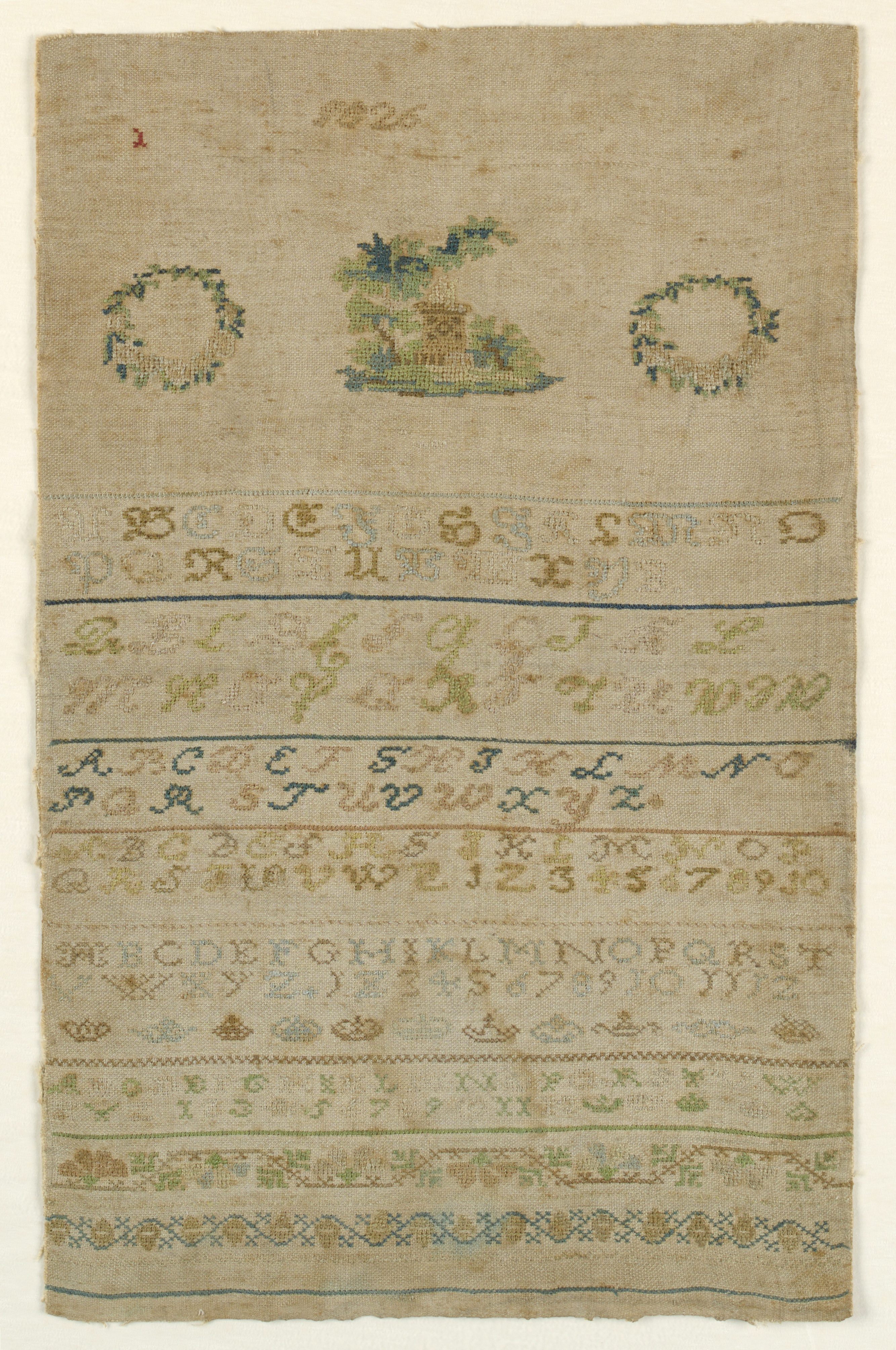 This is a Sampler. It is dated 1826 and we acquired it in 1976. Its medium is silk embroidery on linen foundation and its technique is embroidered in counted cross and herringbone stitches on plain weave foundation. It is a part of the Textiles department.