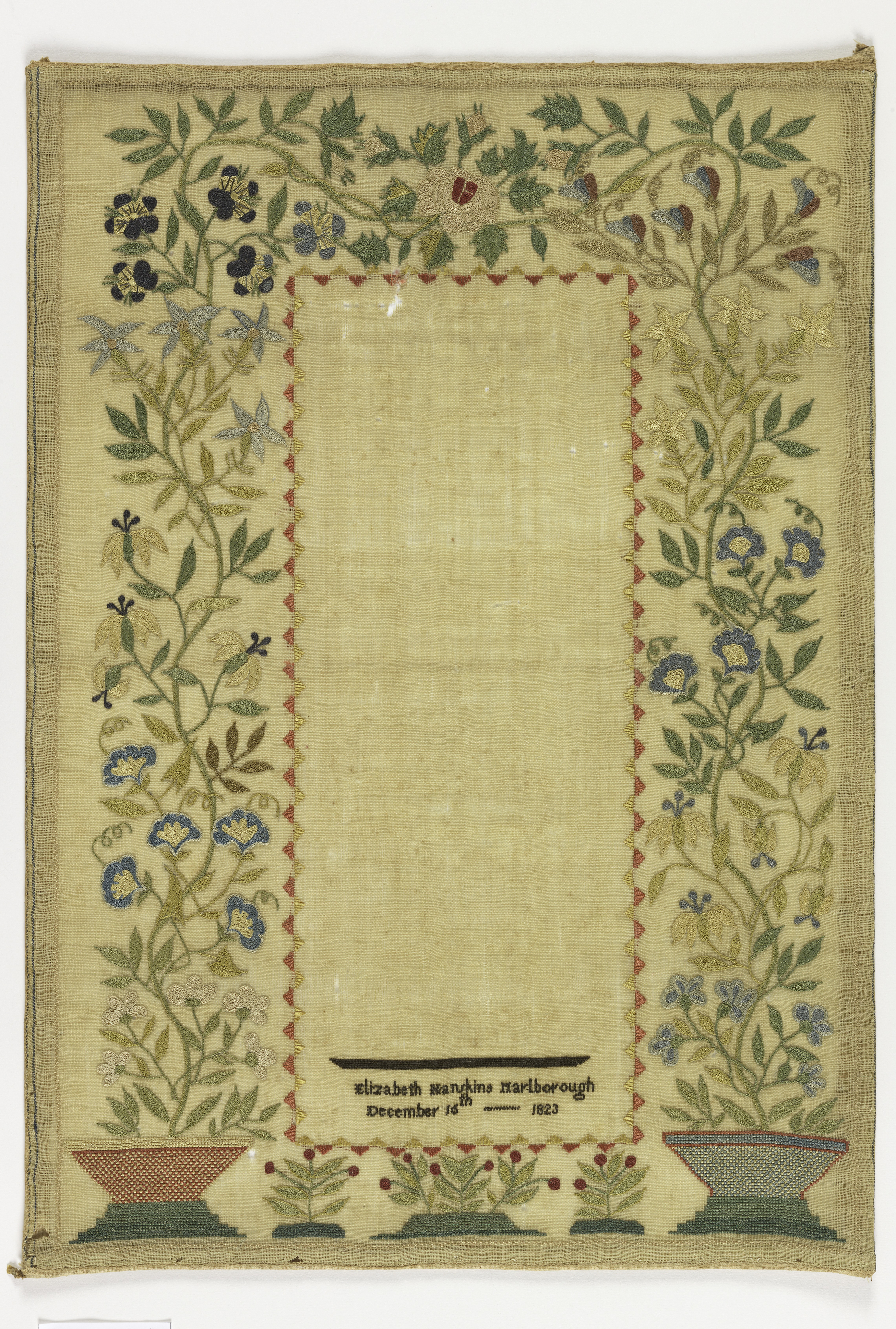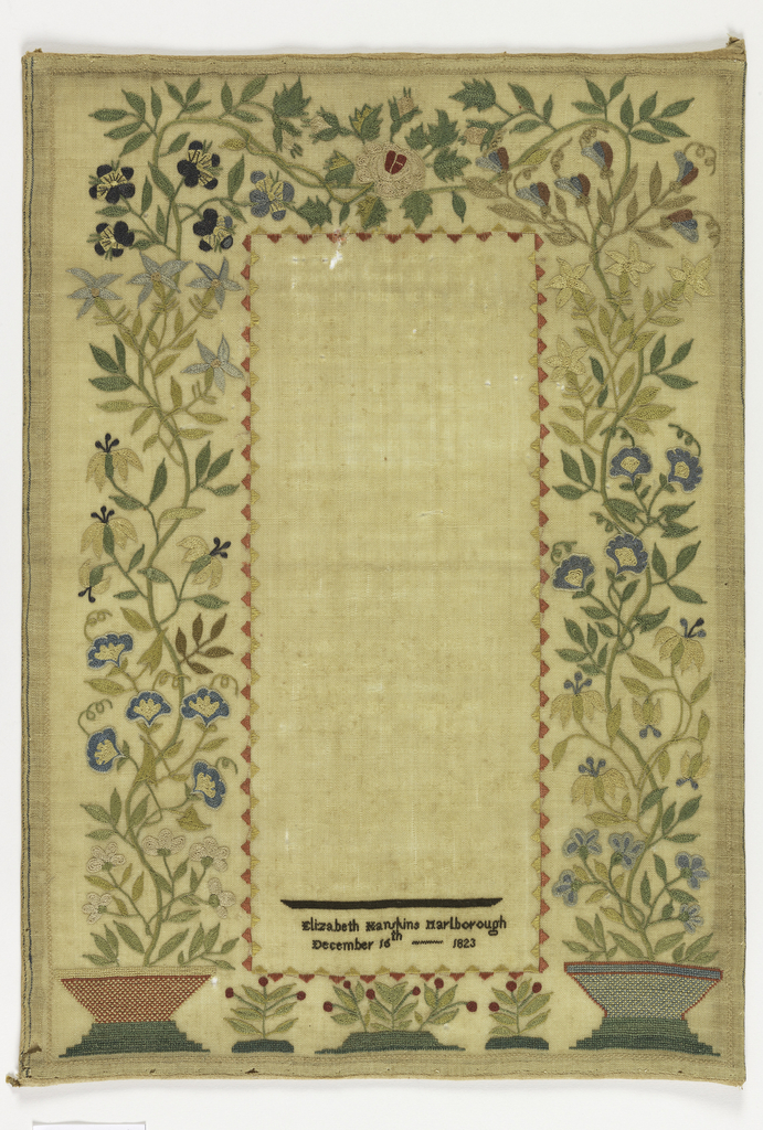 This is a Sampler. It was embroidered by Elizabeth Hanskins Marlborough. It is dated 1823 and we acquired it in 1976. Its medium is silk on wool and its technique is plain weave foundation; chain, satin, and cross stitching; counted and uncounted stitches. It is a part of the Textiles department.