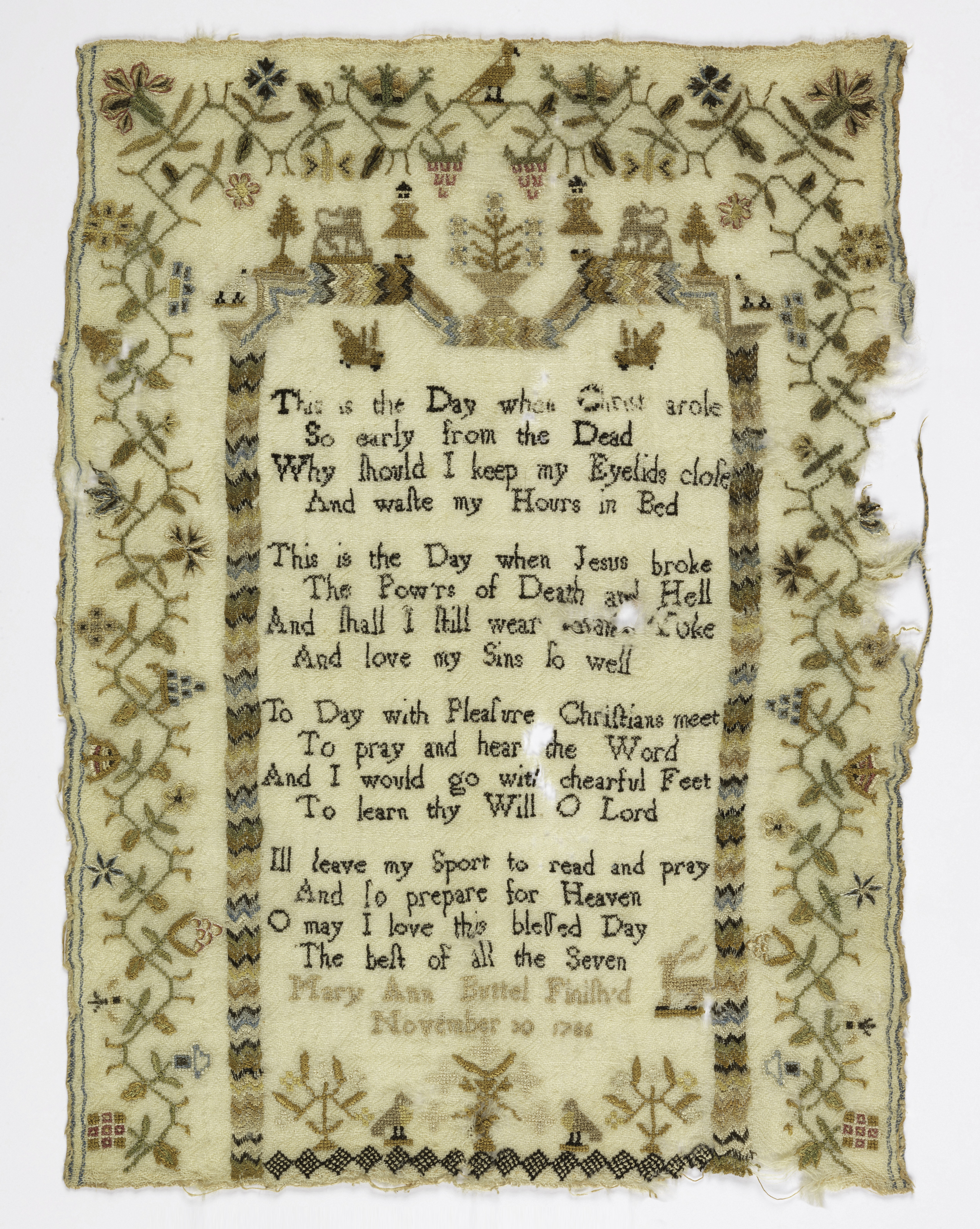 This is a Sampler. It was embroidered by Mary Ann Bottel. It is dated 1786 and we acquired it in 1976. Its medium is silk on wool and its technique is cross, stem, romanian stitches on plain weave wool. counted stitches. It is a part of the Textiles department.