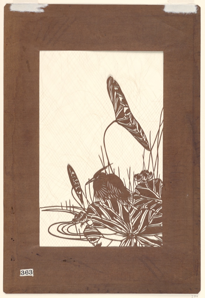 Stencil, Heron, Lotus, Marsh Grasses and Water; Japan; mulberry paper (kozo washi) treated with fermented persimmon tannin (kakishibu), and silk threads (itoire); 46.3 × 31.5 cm (18 1/4 × 12 3/8 in.) Mat: 55.9 × 40.6 cm (22 × 16 in.); Gift of Helen Snyder; 1976-103-13