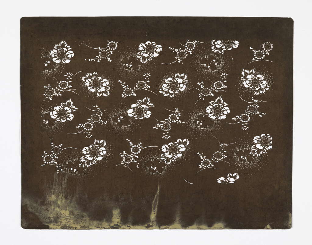This is a Katagami. It is dated late 19th–early 20th century and we acquired it in 1976. Its medium is cut mulberry paper treated with persimmon tannin and silk thread. It is a part of the Drawings, Prints, and Graphic Design department.
