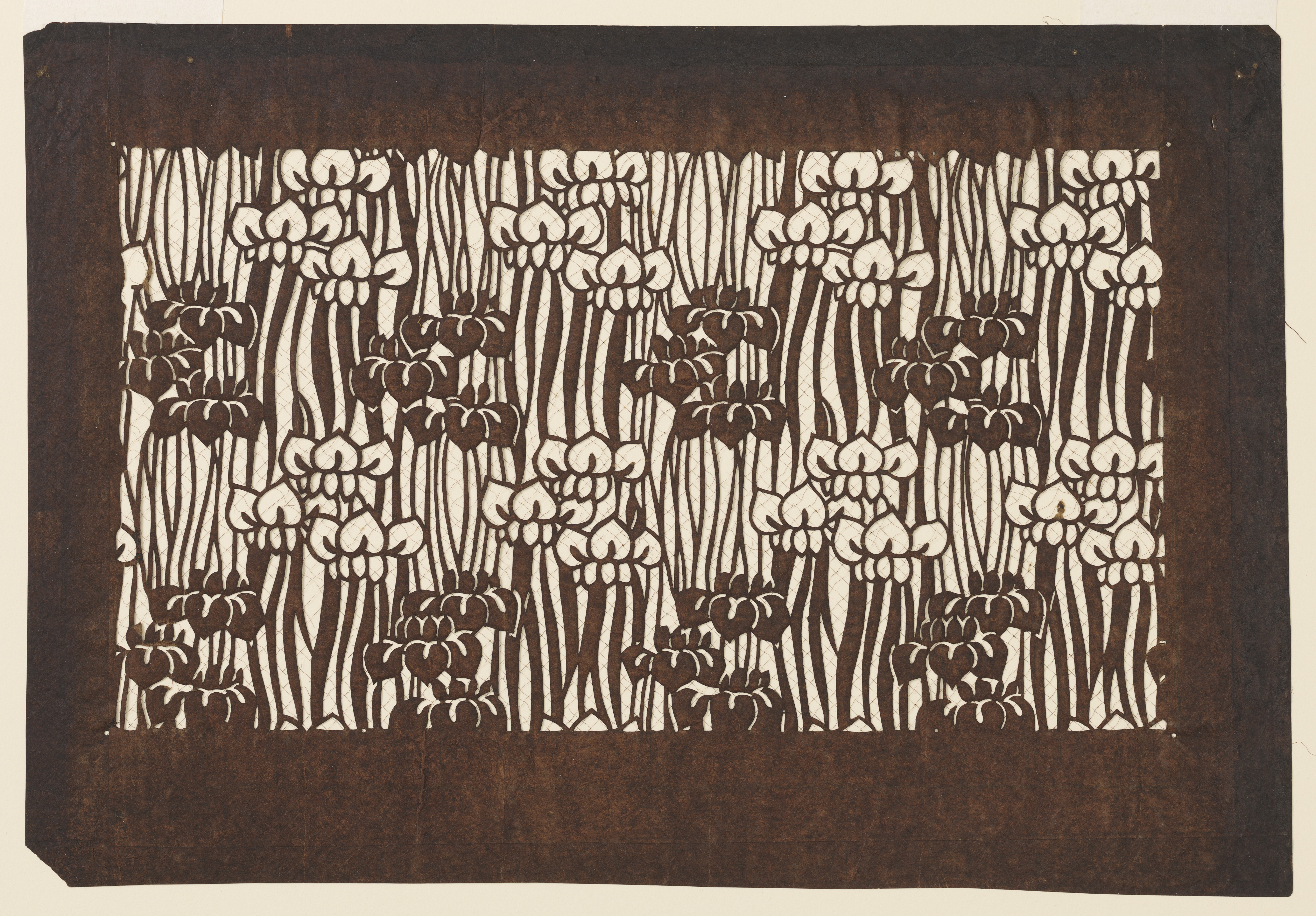 Stencil, Iris motif; Japan; mulberry paper (kozo washi) treated with fermented persimmon tannin (kakishibu), and silk threads (itoire); H x W: 28.6 × 41.9 cm (11 1/4 × 16 1/2 in.) Image: 19.1 × 35.6 cm (7 1/2 in. × 14 in.); Gift of Helen Snyder; 1976-103-151
