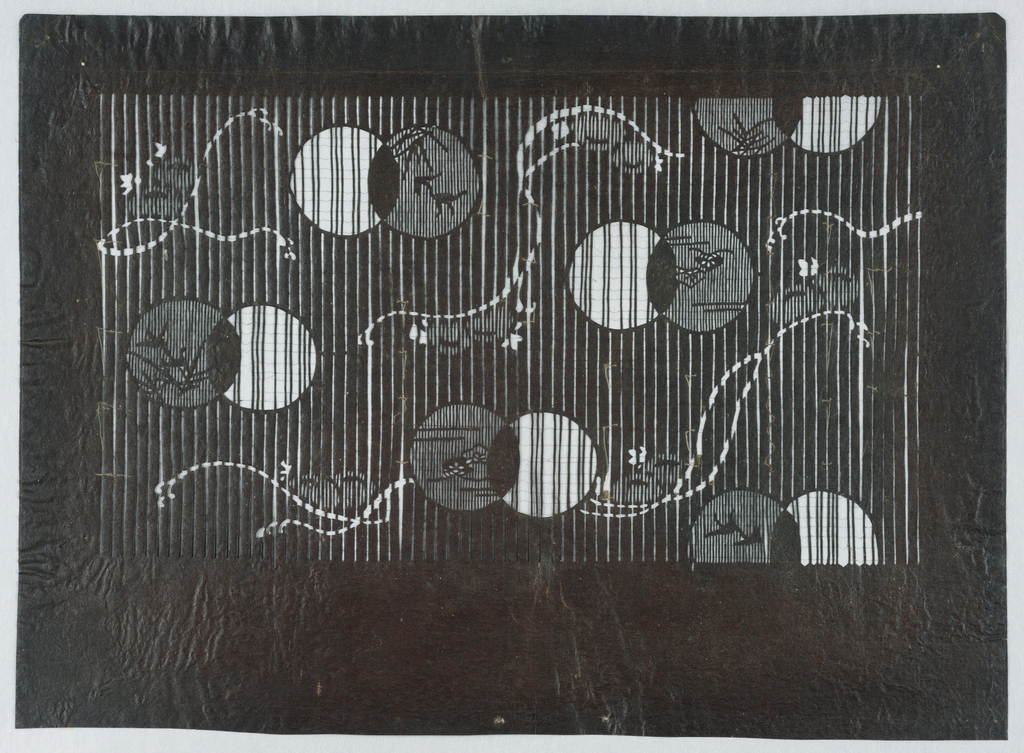This is a Katagami. It is dated late 19th–early 20th century and we acquired it in 1976. Its medium is cut mulberry paper treated with persimmon tannin and silk thread. It is a part of the Drawings, Prints, and Graphic Design department.