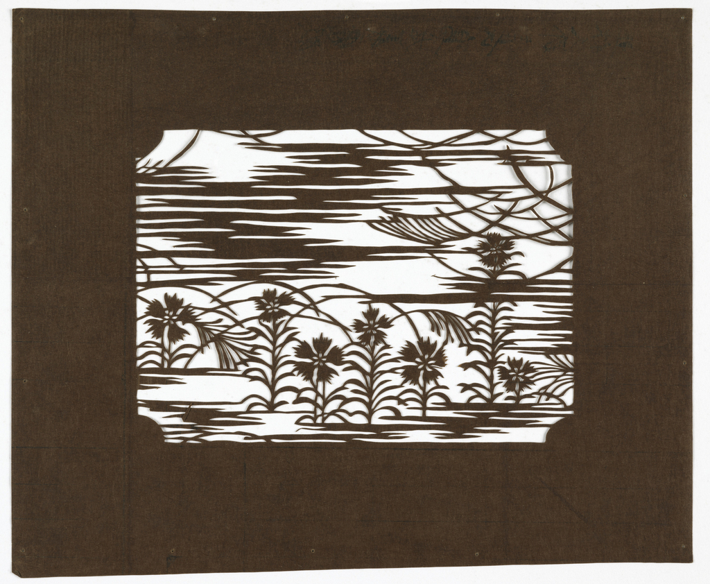 This is a Katagami. It is dated late 19th–20th century and we acquired it in 1976. Its medium is cut mulberry paper treated with persimmon tannin and silk thread. It is a part of the Drawings, Prints, and Graphic Design department.