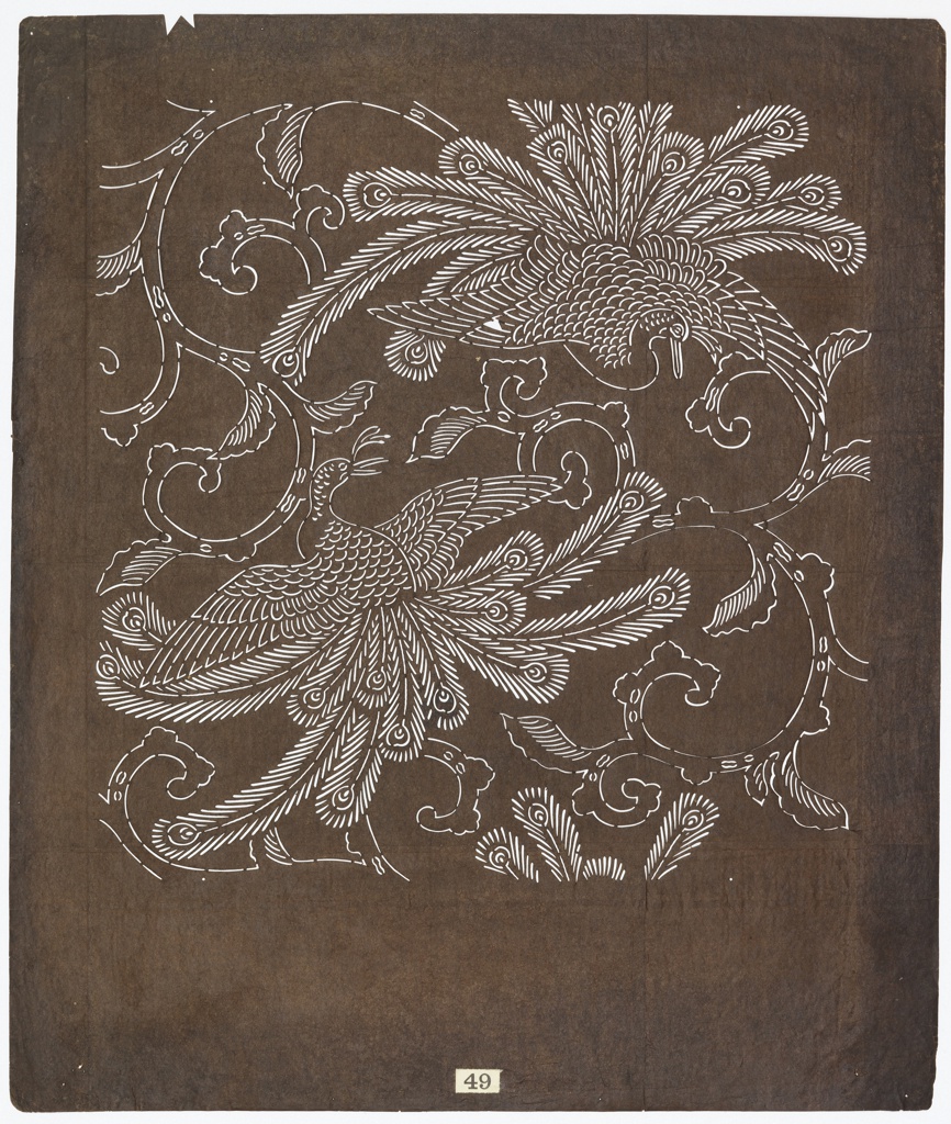 Stencils, Peacocks; Japan; mulberry paper (kozo washi) treated with fermented persimmon tannin (kakishibu); H x W: 49.1 × 41.6 cm (19 5/16 × 16 3/8 in.) Mat: 71.1 × 55.9 cm (28 × 22 in.); Gift of Helen Snyder; 1976-103-241
