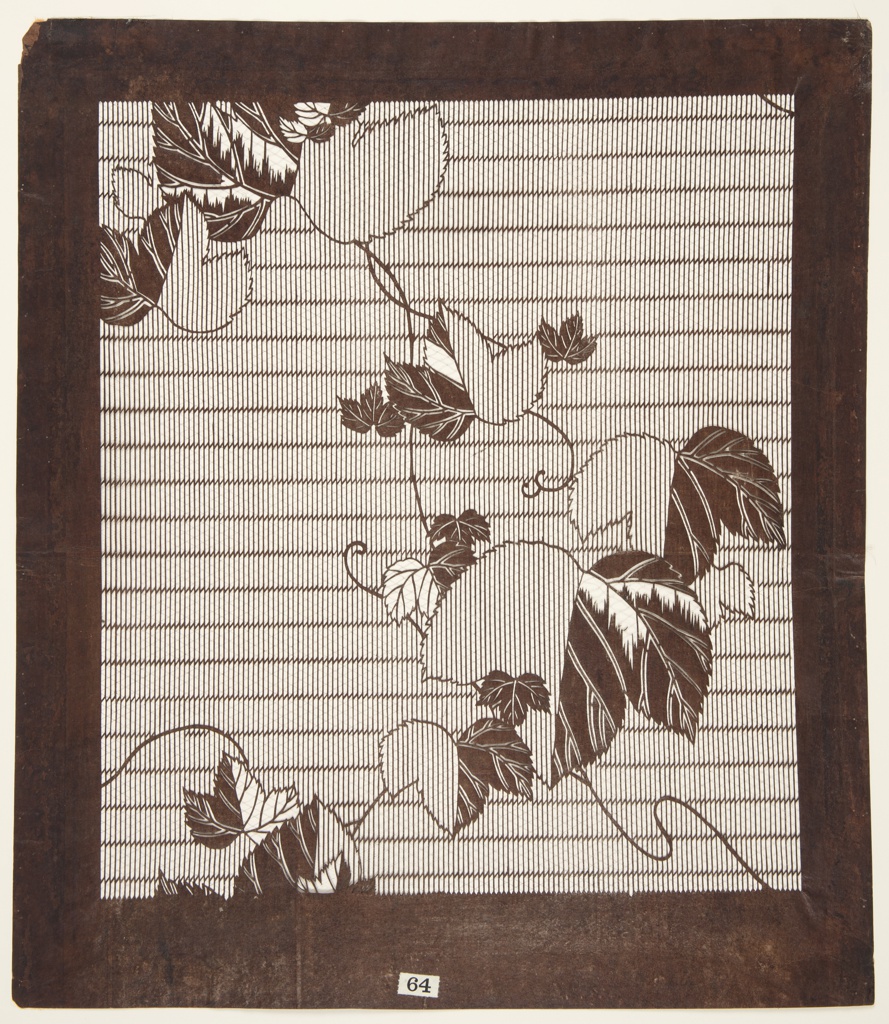 This is a Katagami. It is dated late 19th–early 20th century and we acquired it in 1976. Its medium is mulberry paper (kozo washi) treated with fermented persimmon tannin (kakishibu), and silk threads (itoire). It is a part of the Drawings, Prints, and Graphic Design department.