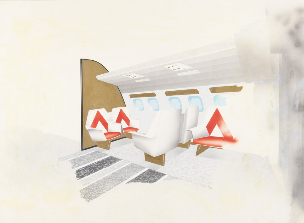 Drawing, Design for Convair 880 Airplane Club Area; Designed by Dorothy Draper (American, 1889–1969); Office of Dorothy Draper & Co., Inc. (United States); Client: General Dynamics Corporation (United States); USA; airbrushed gouache, brush and gold paint, graphite on illustration board; H x W: 50.5 × 70.5 cm (19 7/8 × 27 3/4 in.); Gift of Carleton Varney and Richard Hunnings; 1977-106-1