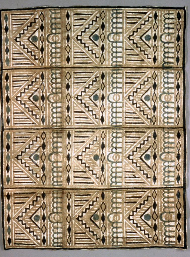 This is a Tapa cloth. It is dated early 20th century and we acquired it in 1977. Its technique is beaten, relief printed and painted. It is a part of the Textiles department.