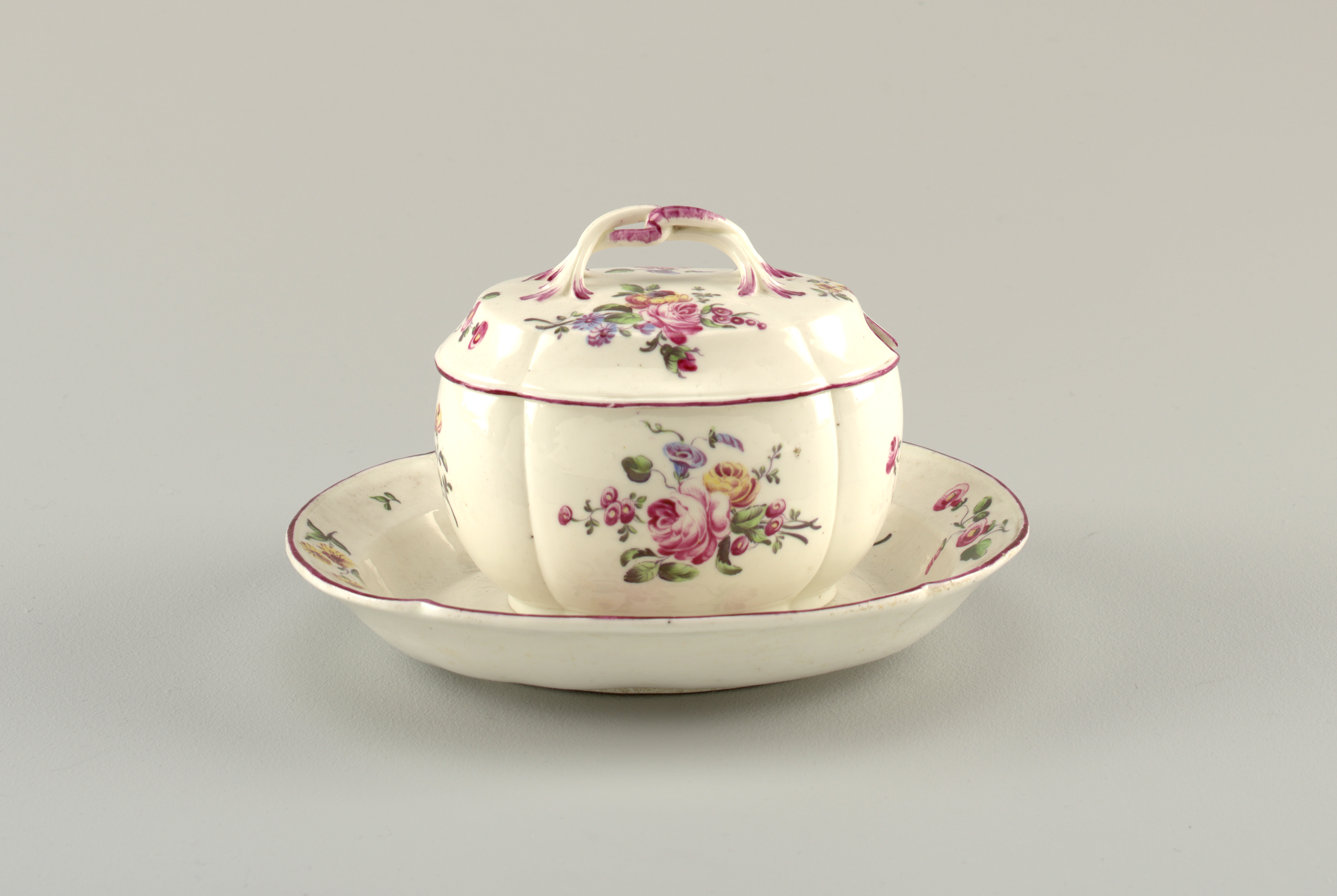 This is a sugar bowl and stand. It was manufactured by Mennecy Porcelain Manufactory. It is dated mid- 18th century and we acquired it in 1977. Its medium is soft paste porcelain, vitreous enamel. It is a part of the Product Design and Decorative Arts department.
